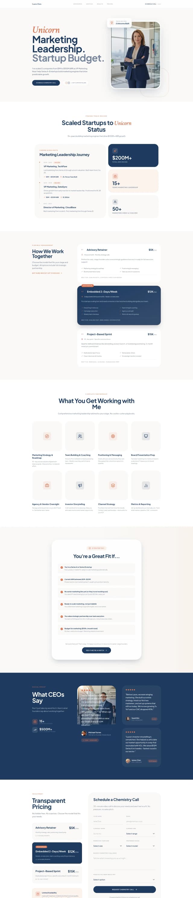 A professional yet personable landing page for *Laura Chen, Fractional CMO*—an ex-unicorn VP Marketing offering part-time CMO services to Series A–B startups. Navy and warm terracotta tones with executive photography balance credibility and approachability. Features hero with bold positioning headline, credentials timeline, service models, value checklist, ideal client profile, CEO testimonials, transparent pricing, limited availability notice, and chemistry call booking—communicating senior leadership without full-time overhead.