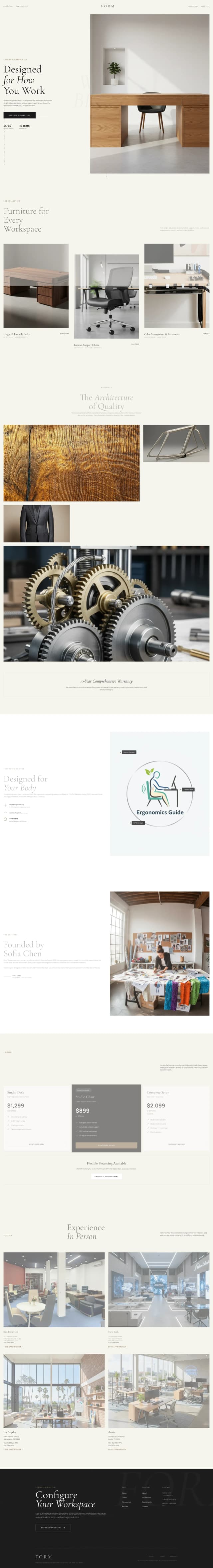 A sleek, product-focused landing page for *Form*—a premium ergonomic furniture brand for modern home offices. Clean white backgrounds, studio-quality photos, and architectural layouts highlight desks, chairs, and accessories. Features hero with dramatic product shot, category cards with hover zoom, materials and craftsmanship gallery, ergonomics section, designer profile, pricing with financing, showroom locations, and a “Design Your Setup” configurator CTA—blending style, comfort, and functionality.