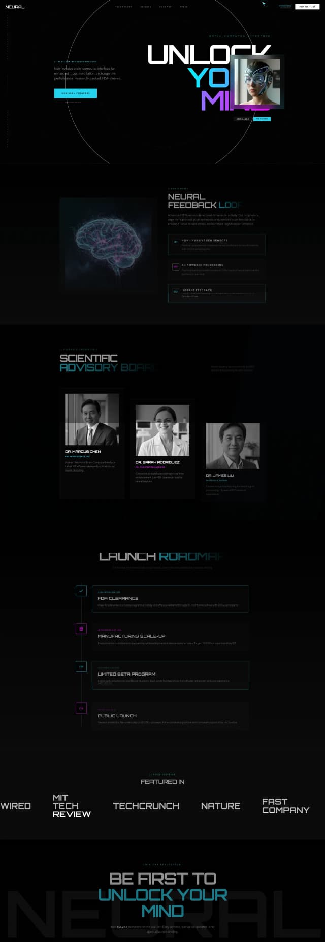 A futuristic, cyberpunk-inspired landing page for *Neural*—a next-gen brain-computer interface company with FDA-cleared, non-invasive neural wearables. Deep black background with neon cyan and magenta accents, glitch effects, and holographic visuals set a high-tech tone. Features hero with 3D headset render, glitch-animated “Unlock Your Mind” headline, brain visualization tech explainer, scientific advisory credentials, development roadmap, early access waitlist with “Join 50K Pioneers” counter, press coverage, and a pulsing neon CTA—conveying innovation, credibility, and cutting-edge experience.