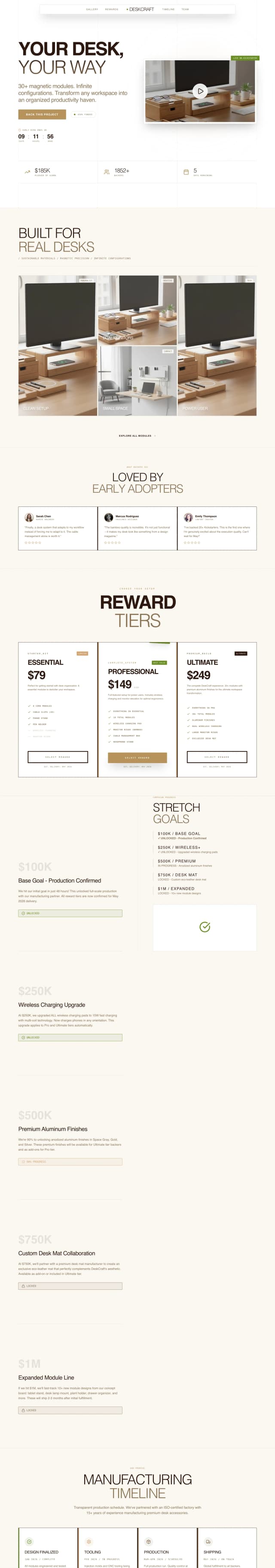 A clean, product-driven Kickstarter landing page designed to showcase DeskCraft—a modular magnetic desk organization system—by highlighting its adaptability, premium sustainable materials, and everyday functionality through lifestyle workspace imagery, a hero product video, and clear feature storytelling, while driving conversions with real-time funding progress, reward tier cards, stretch goals, social proof from backers, transparent manufacturing and shipping timelines, a founder-led team introduction, and an urgency-driven early bird countdown.