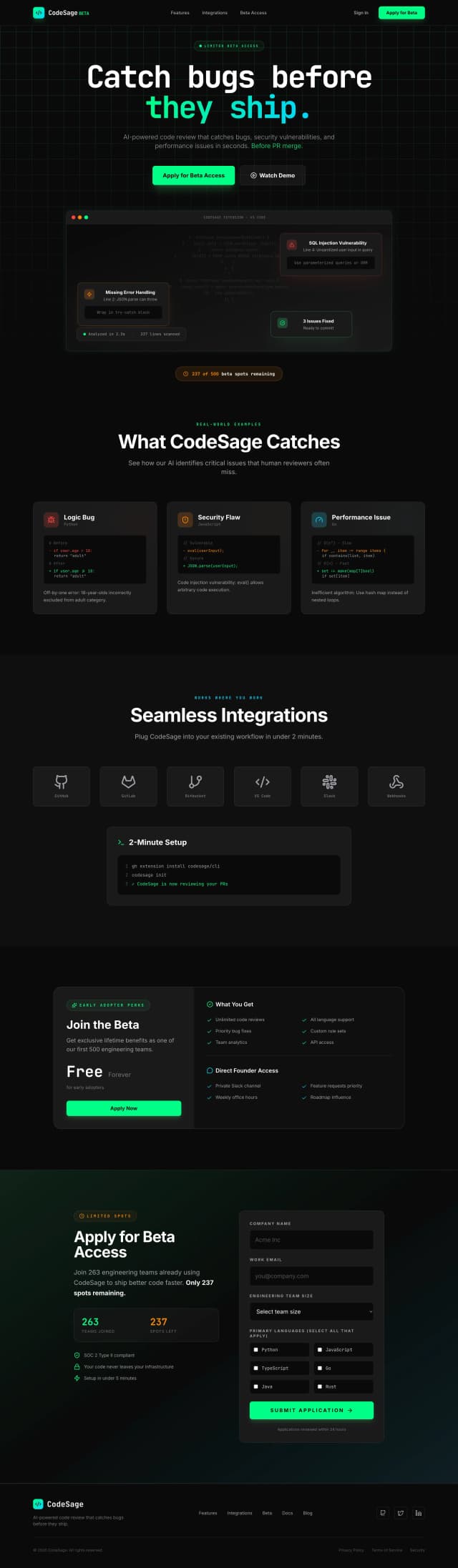A developer-focused beta landing page designed to introduce CodeSage an AI-powered code review assistant that catches bugs, security vulnerabilities, and performance issues before pull request merge—using a dark-mode interface with syntax-inspired accents, real-world code examples, and tool integrations, while driving qualified engineering teams to apply through clear beta benefits, social proof from supported platforms, and a transparent urgency indicator showing limited remaining spots.