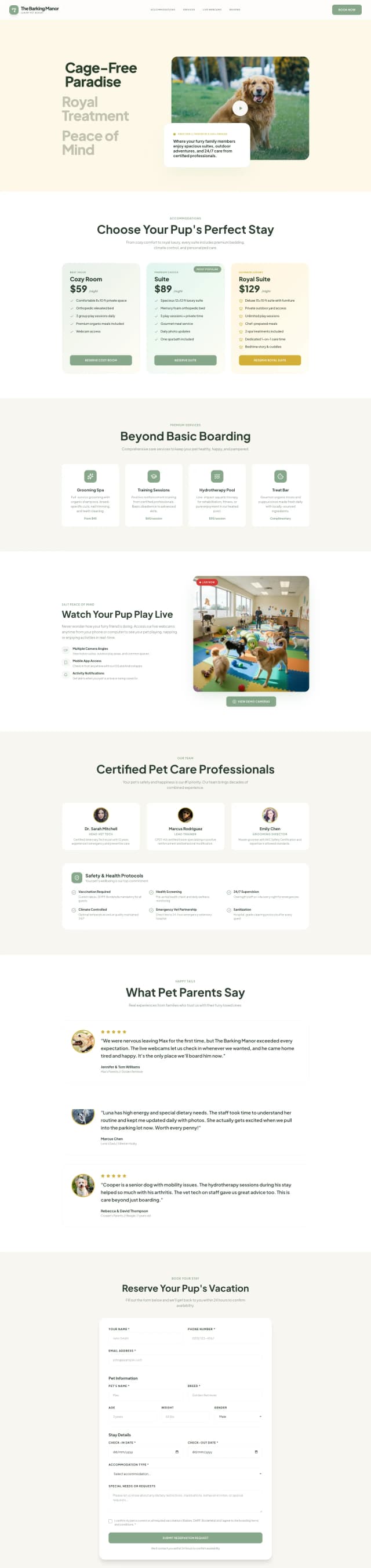 A playful yet upscale landing page designed to present The Barking Manor as a luxury, cage-free pet resort—highlighting premium accommodations, spa and training services, and live webcam access through warm, inviting visuals and resort-style storytelling—while building trust with certified staff credentials, clear safety protocols, heartfelt pet parent testimonials, and an intuitive reservation request flow that makes booking feel as comfortable and reassuring as the stay itself.