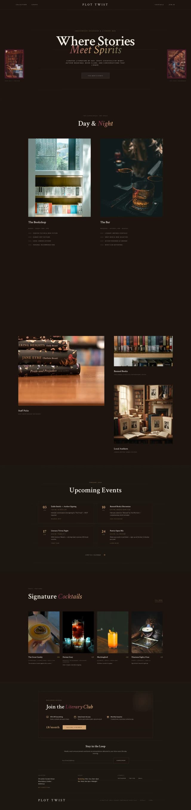 A moody, story-driven landing page designed to introduce Plot Twist—an independent bookshop by day and a literary cocktail bar by night—blending curated books, signed editions, and novel-inspired cocktails within an intimate, library-lit atmosphere, while inviting visitors to explore its dual identity, upcoming literary events, signature drinks, and membership perks through rich visuals, refined typography, and community-focused storytelling that encourages discovery, visits, and ongoing connection.