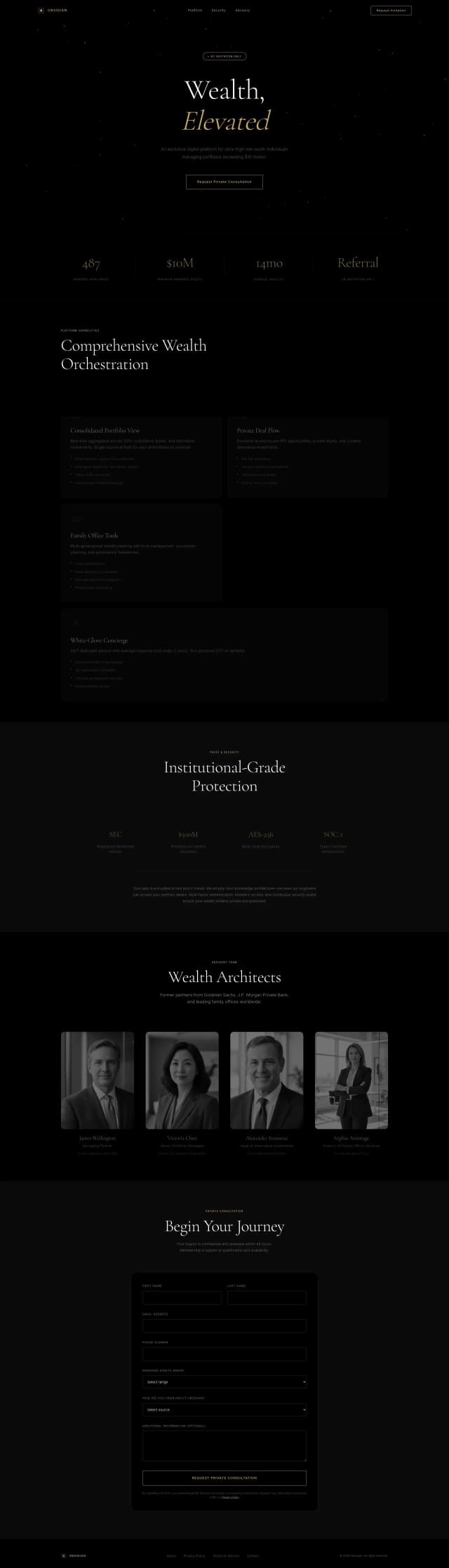 An ultra-premium, invitation-only landing page designed to present Obsidian—an exclusive digital platform for ultra-high-net-worth individuals managing $10M+ portfolios—through a refined black-and-gold visual language, elegant typography, and subtle, luxurious motion, while quietly communicating power, privacy, and trust by revealing sophisticated wealth management tools, elite advisory access, and white-glove services in a restrained, confidence-driven experience that prioritizes discretion and exclusivity above all else.