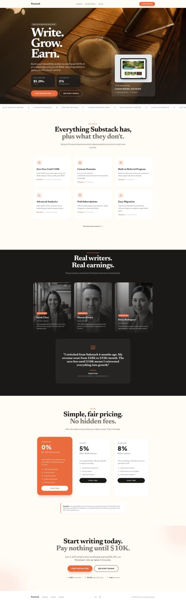 A clean, literary-focused landing page designed to introduce Penstack a newsletter platform empowering writers to grow audiences and monetize content—by highlighting custom domains, zero-fee monetization, and referral tools through warm, approachable visuals, clear feature comparisons, real creator success stories, and an earnings spotlight, while guiding visitors to start writing with simple pricing, persuasive testimonials, and a prominent call-to-action.