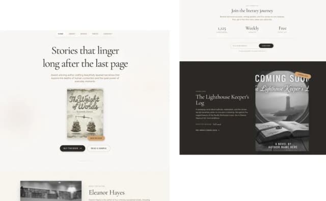 A personal brand site for an author to promote books, grow readership, and drive sales. Hero with 3D book cover, headline and CTAs. Sections: synopsis, author bio with portrait, book/series showcase, reader testimonials, press quotes, events, newsletter signup, and contact. Design vibe: warm, elegant, minimal, with literary charm. SEO structured with Book, Author, Review, and CreativeWork schema for discoverability.