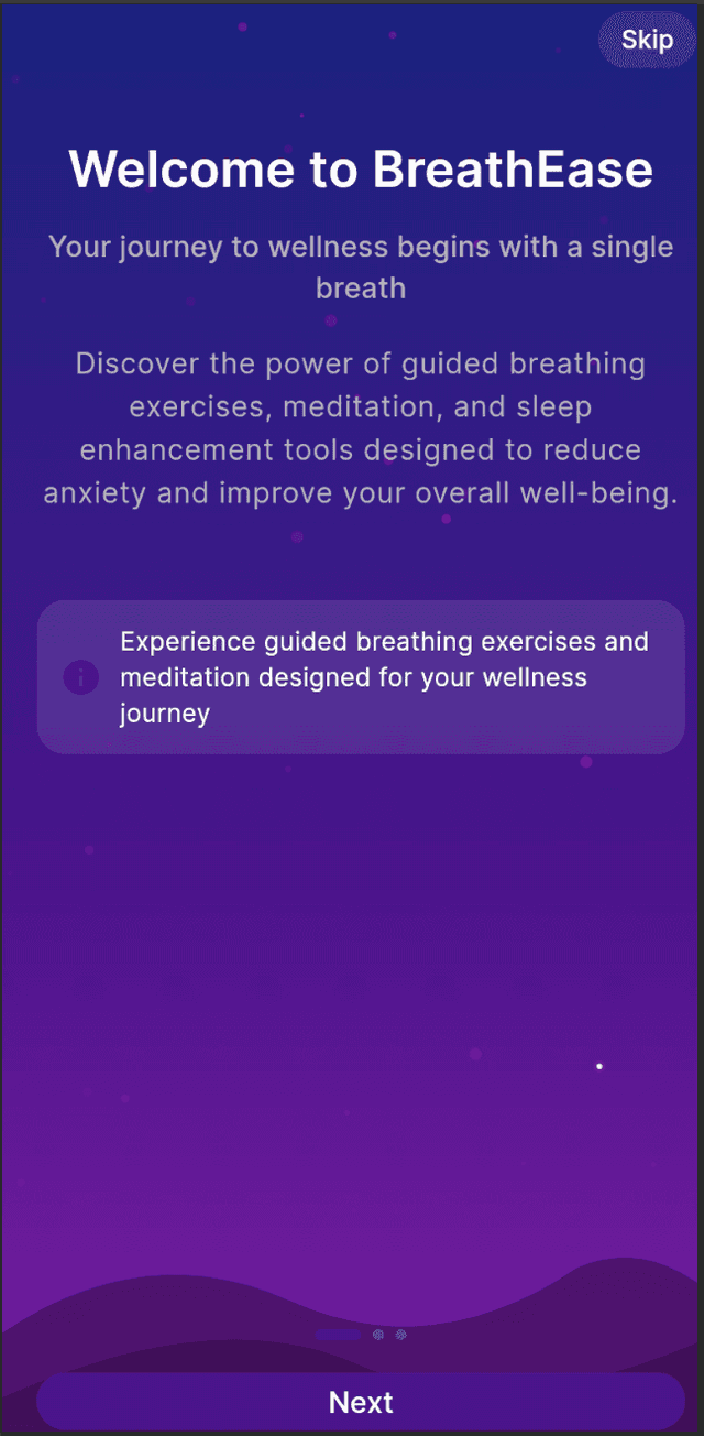 This app template is designed to help users practice mindfulness through guided breathing exercises. Its key features include animated visualizations for inhale and exhale cycles, personalized session tracking with a calendar view, and a dashboard to view your progress and history. It's a simple tool for daily wellness.