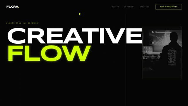 A dark, modern landing page for a design conference showcasing bold outlined typography, neon-orange accents, speaker cards, interactive program tabs, and a parallax hero section that encourages visitors to register.