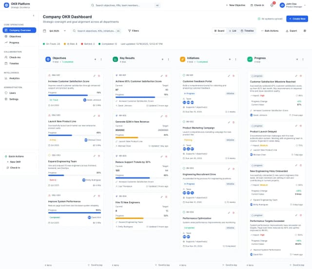 The OKR Platform template is a powerful tool for managing objectives, key results, and team collaboration. It provides a clear timeline view to track milestones, progress, and dependencies across departments. Features include analytics for performance insights, team check-ins for real-time updates, and customizable dashboards. Suitable for both technical and non-technical users, it enhances strategic planning and alignment with an intuitive interface and comprehensive reporting.