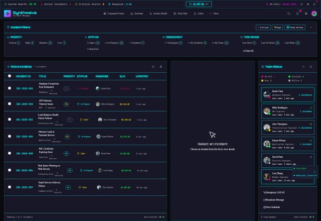 This template is an internal tool for incident management, designed to help both technical and non-technical users monitor and resolve system issues effectively. It features real-time system health tracking, detailed incident reports, team status updates, and compliance dashboards. With intuitive filters, alert queues, and integration tools, it ensures quick response times and comprehensive oversight, making it ideal for managing critical alerts and maintaining system stability.