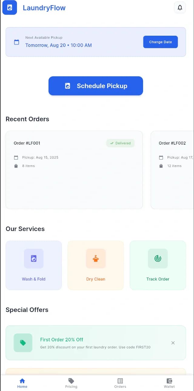 LaundryFlow is a user-friendly template designed for managing all your laundry needs in one place. Easily schedule pickups, track your orders in real time, and view detailed order history. You can check garment pricing, use special offers, and explore services like Wash & Fold and Dry Clean. The intuitive interface makes it simple for anyone, whether technical or not, to handle laundry tasks quickly and efficiently.