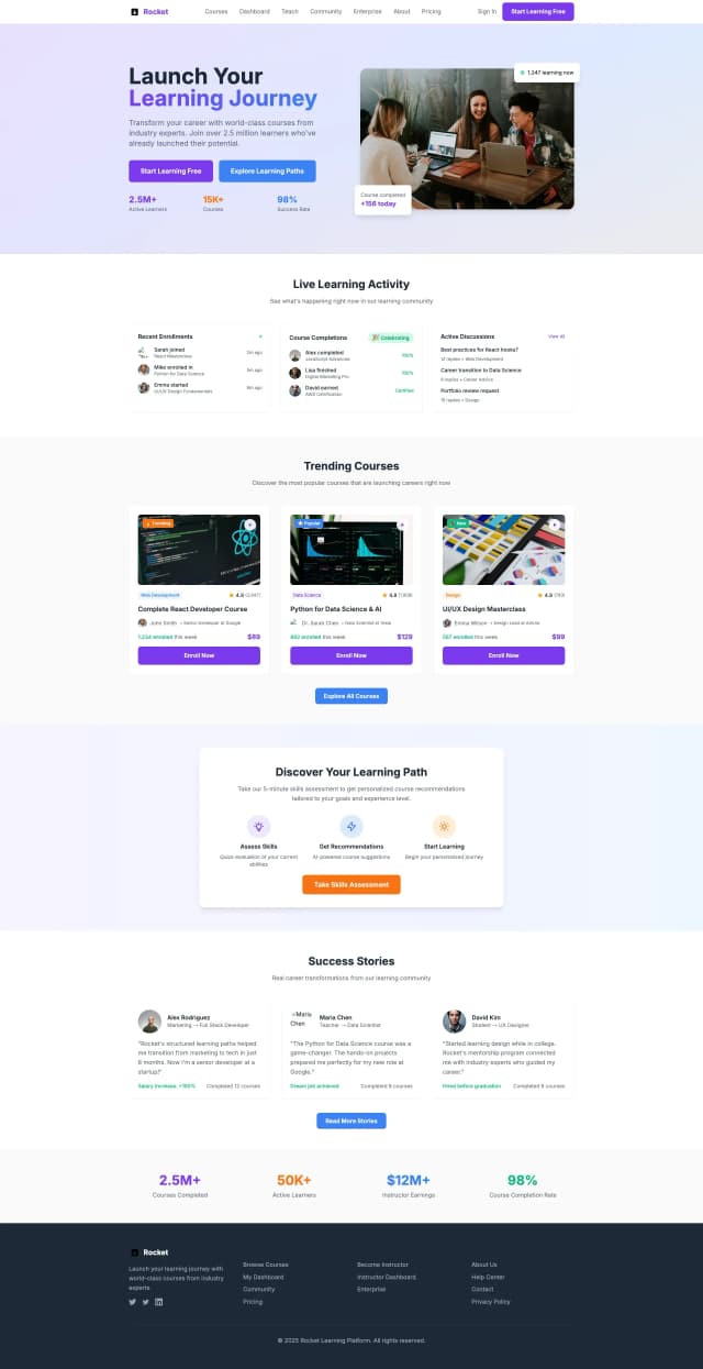 This course landing page helps promote digital marketing programs with a clear and persuasive layout. It showcases course details, instructor credentials, curriculum modules, student testimonials, and career outcomes. Pricing plans and enrollment options are clearly presented, with an optional email capture form for lead generation. This template is ideal for coaches, instructors, or academies to drive enrollments and offer online or hybrid learning programs.