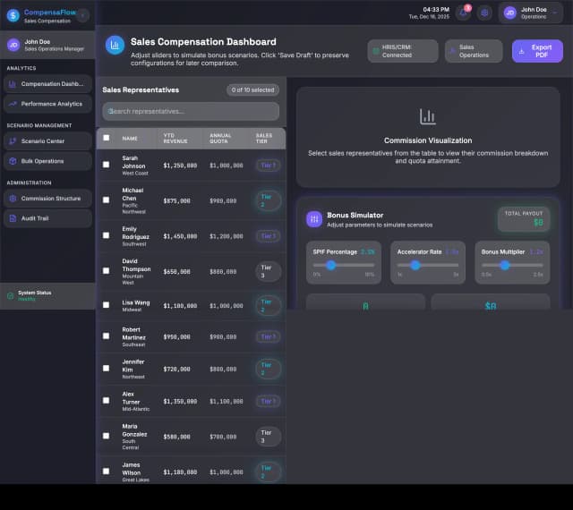 This Sales Compensation Management template helps teams manage, simulate, and analyze commission structures with ease. It features tools like bonus simulators, real-time performance analytics, bulk operations for mass updates, and detailed role configurations. Users can track revenue, quota attainment, and payouts with visual dashboards and benchmarking insights. With error handling, rollback options, and scenario testing, it streamlines complex compensation workflows—ideal for both technical admins and non-technical sales leaders.