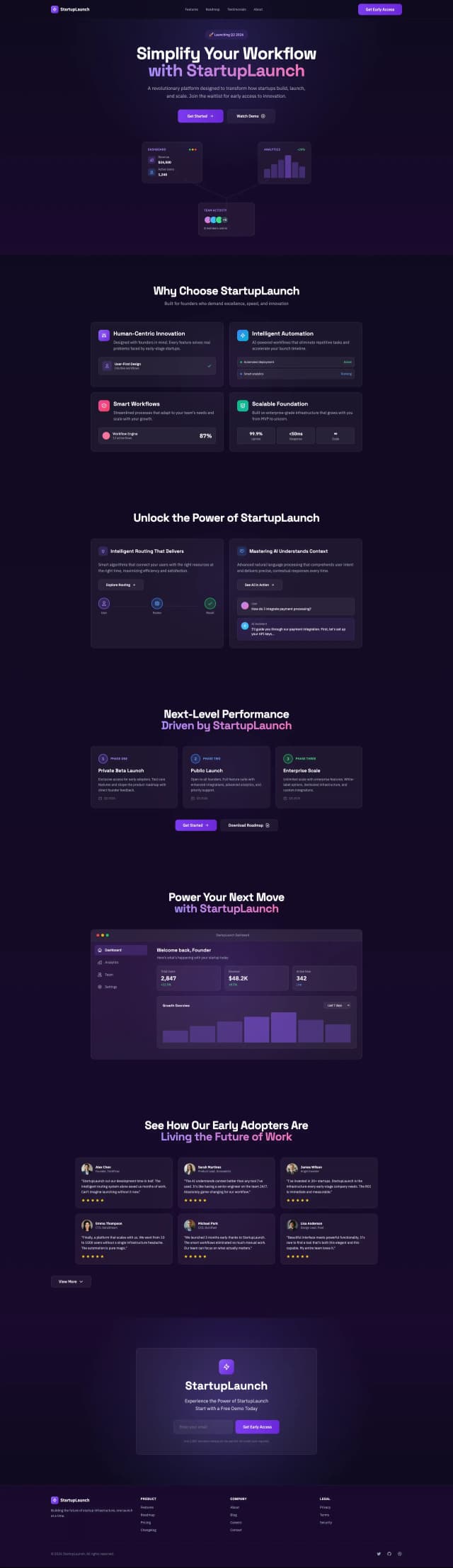 This Product Launch landing page template is designed to build excitement and capture leads before your big release. With sections for highlighting key features, innovation journey, user testimonials, and FAQs, it helps you engage early adopters and grow a waitlist. Perfect for startups and tech launches, it combines modern design with clear calls to action for maximum impact.