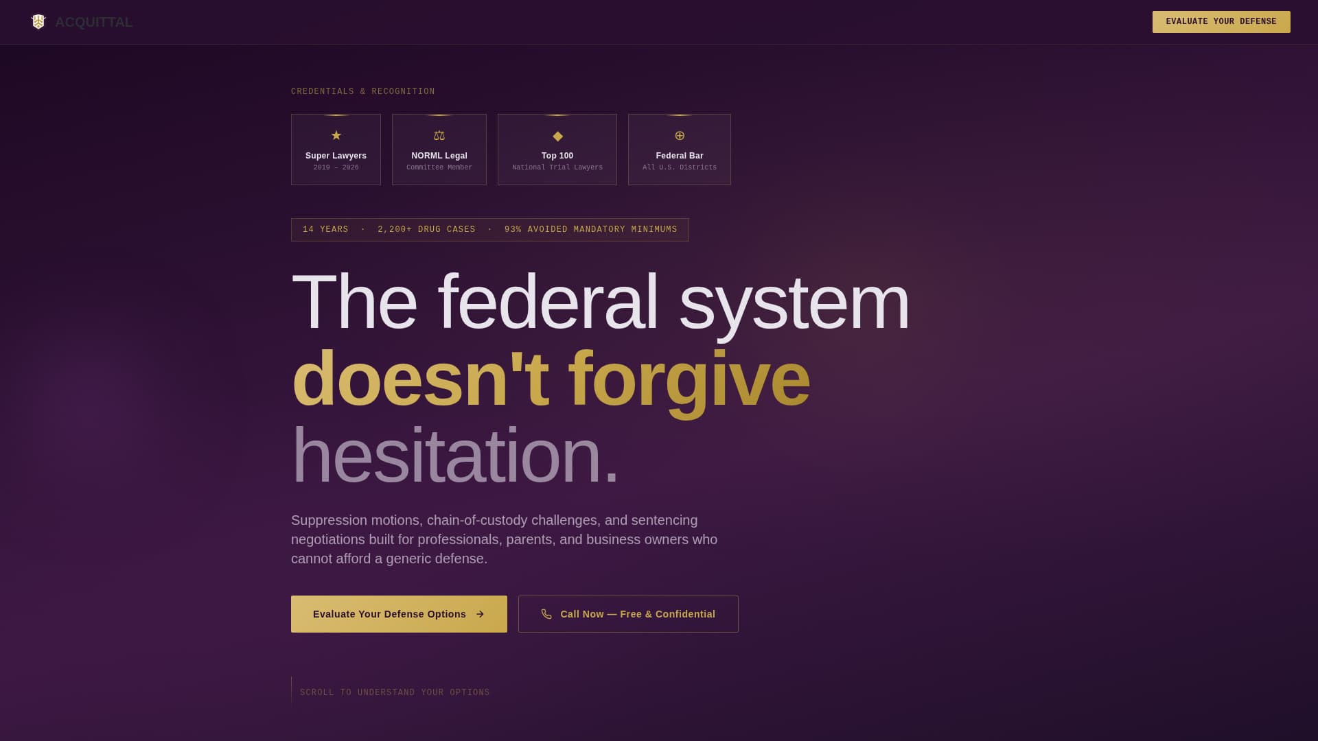 Acquittal is a single-column landing page template built for federal drug crime defense attorneys. It follows a Problem-to-Solution scroll arc, opens with credential badges and authority statistics, then guides visitors through charge stakes, prosecution vulnerabilities, and a five-step defense assessment quiz. The design uses deep plum, decisive gold, and brushed platinum to project corner-office authority from the first scroll.