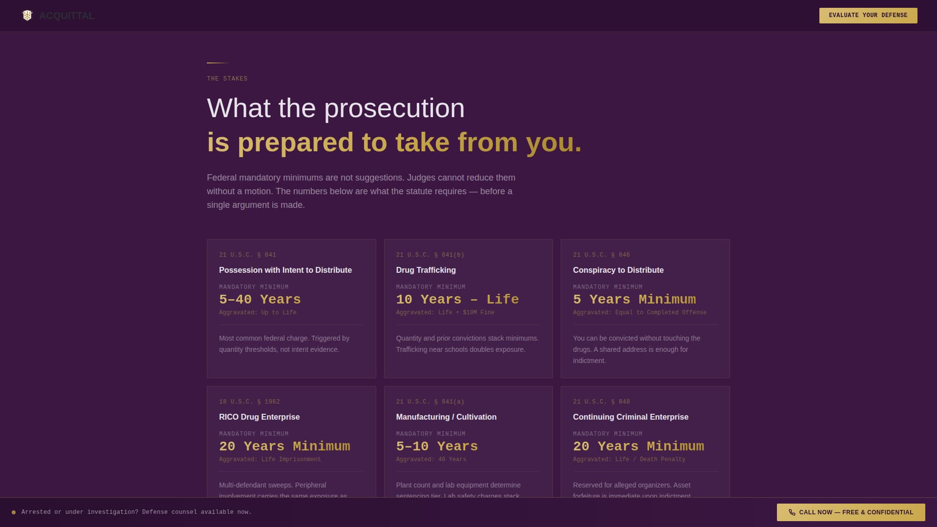 This section names exact federal charges: possession with intent, drug trafficking, conspiracy, and manufacturing. Each charge displays its mandatory minimum sentence in stark gold numerals. The weight of the stakes lands visually before the visitor reads a word of copy.