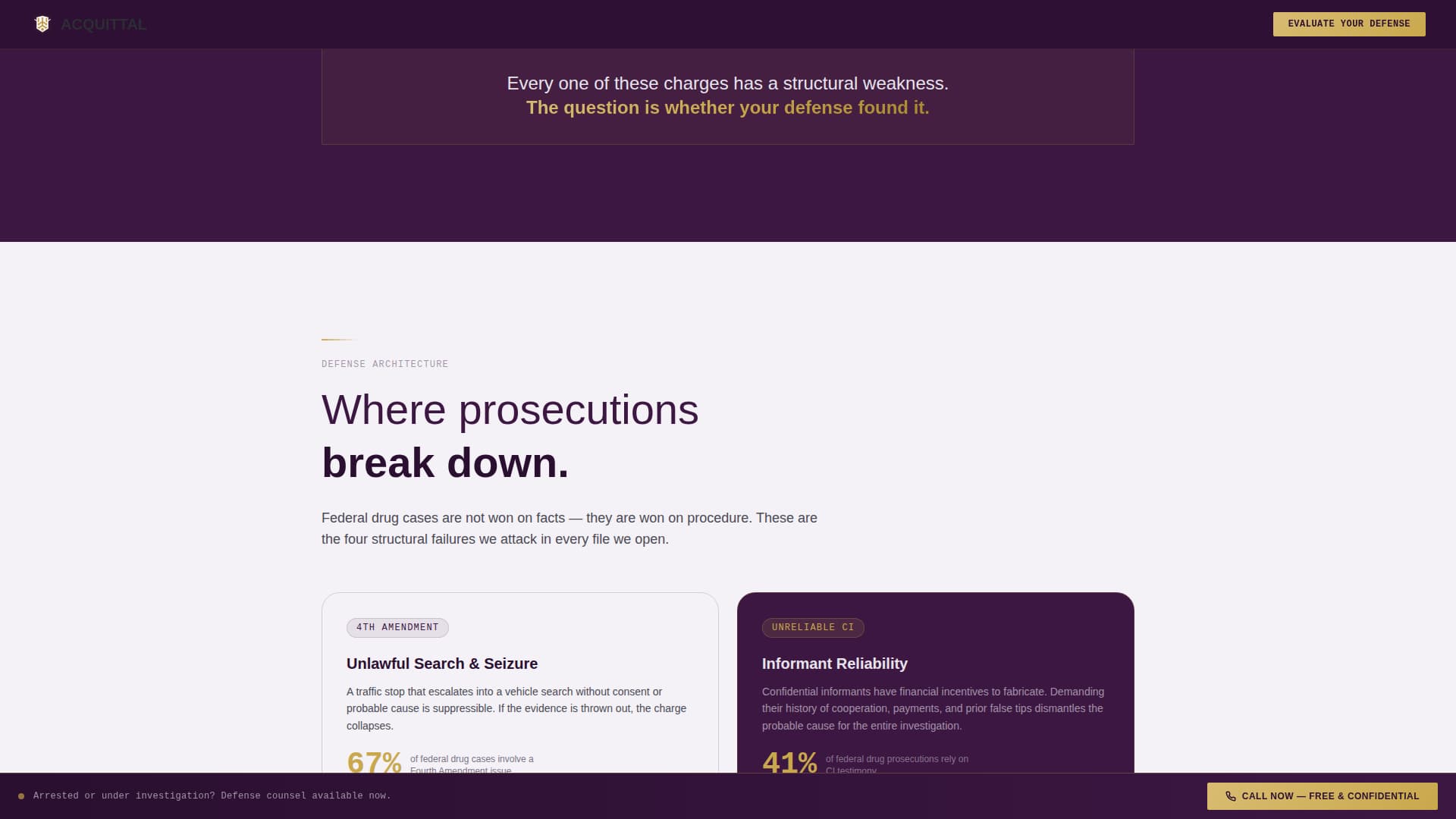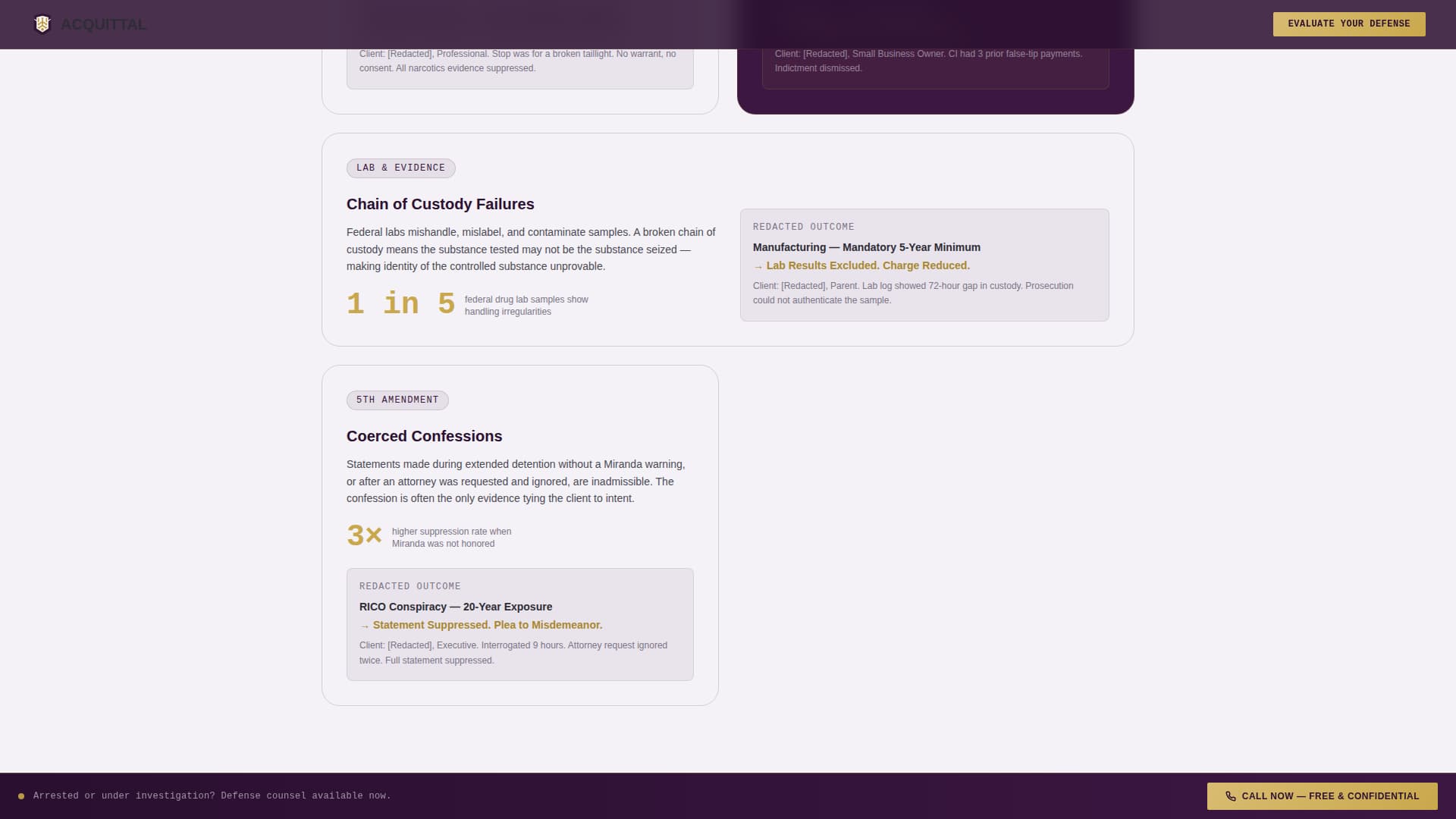 Acquittal is a high-stakes landing page template for drug crime defense lawyers. It moves visitors from fear to confidence through a structured scroll arc, credential-first header, charge-and-stakes section, prosecution vulnerability breakdown, and a five-step guided assessment quiz. Every design choice signals serious, senior-level legal representation.