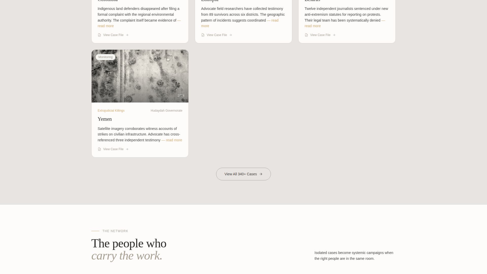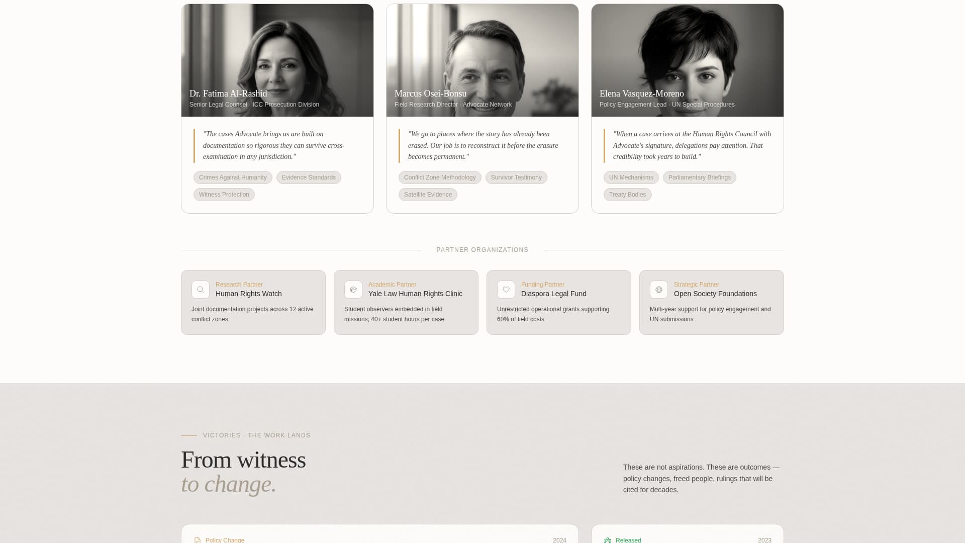 Midway through the scroll, advocate profiles and partner organization cards reorganize into collaborative clusters. These sections show how individual cases connect into systemic campaigns, introducing mentor figures and institutional partners who give the work credibility.