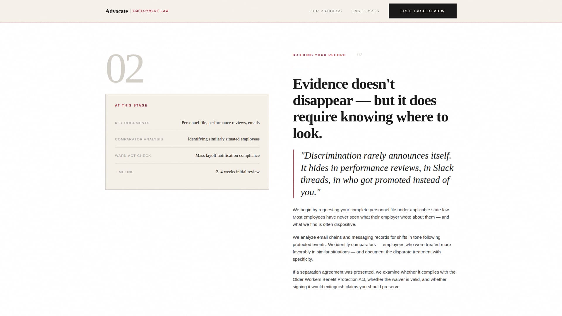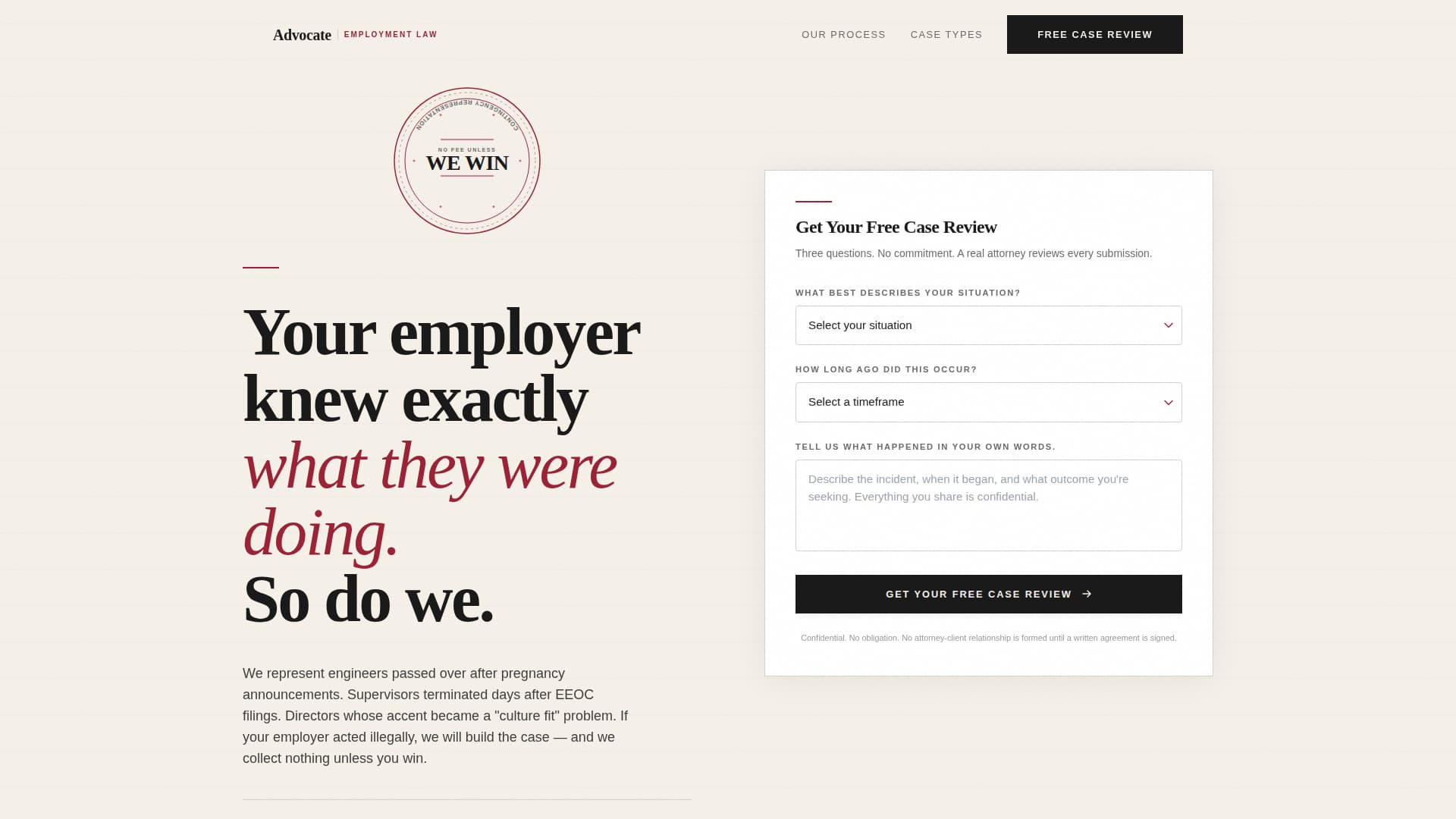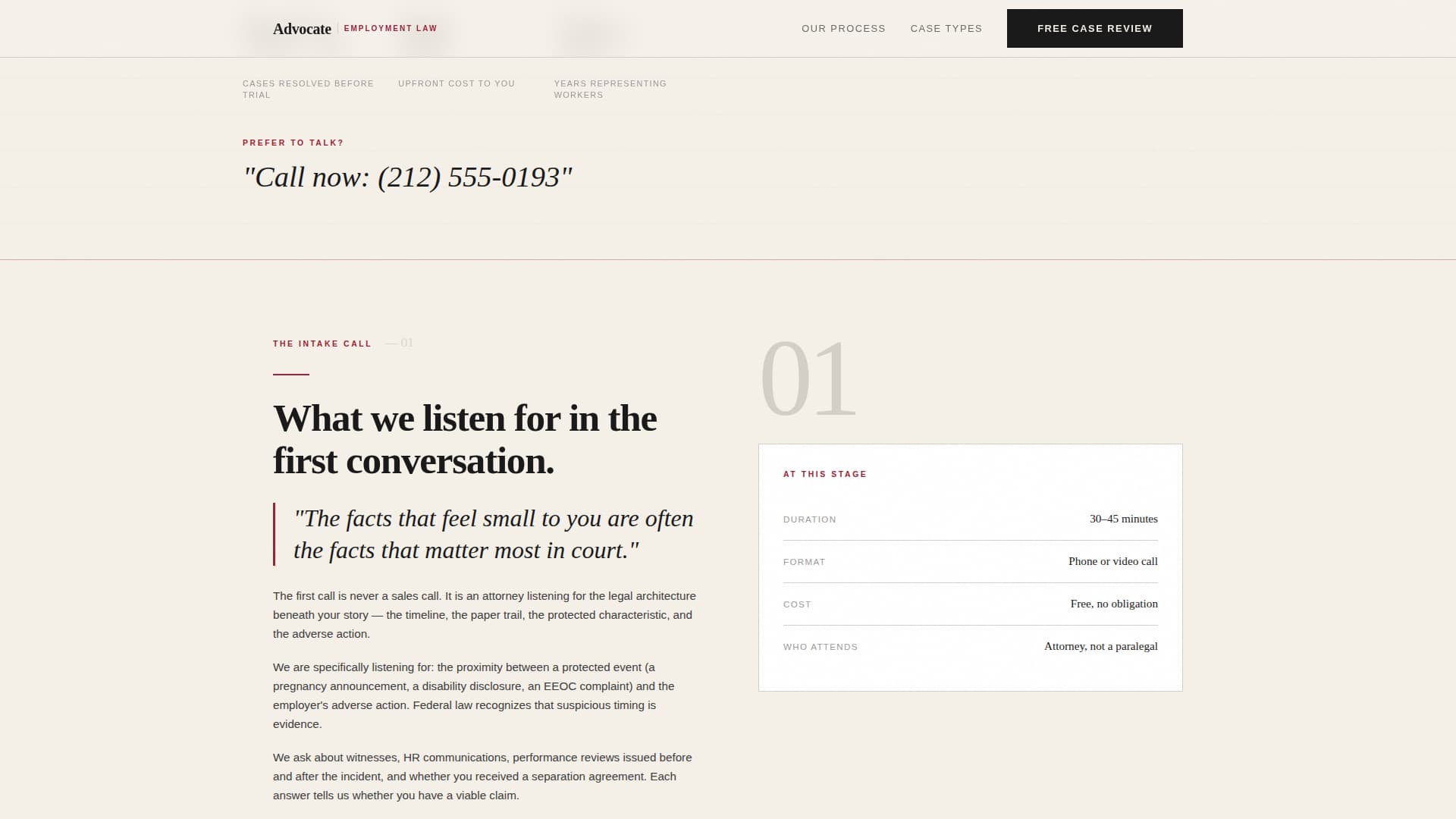 Advocate is a single-page employment discrimination attorney landing page template built around an editorial magazine aesthetic. It guides injured workers through a transparent four-stage case process, from the intake call to potential litigation, while a contingency-fee guarantee badge and a three-question lead form convert urgency into booked consultations. No fluff, no stock photos, just authority.