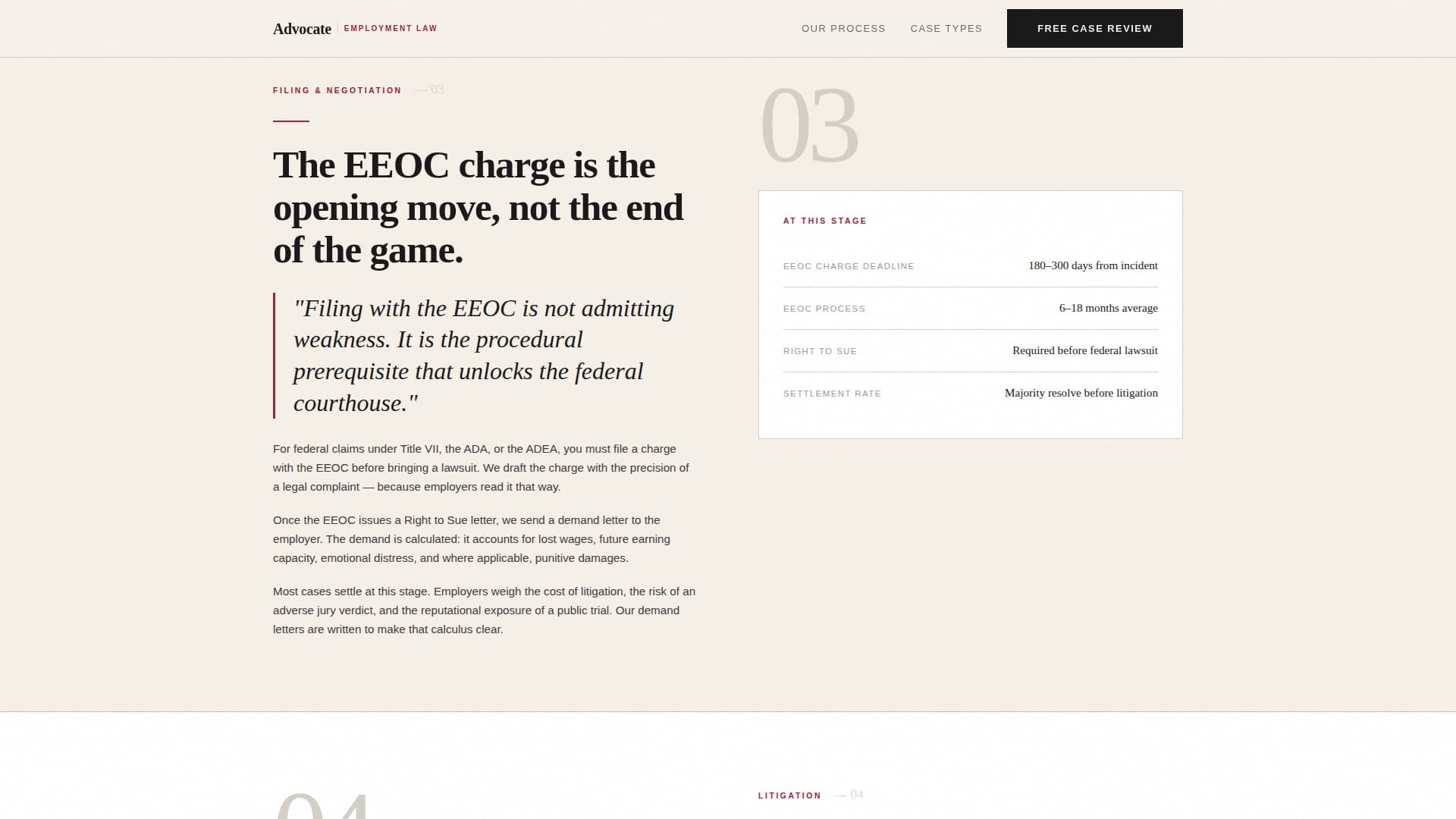 | Filing & Negotiation | Covers EEOC process and demand strategy |