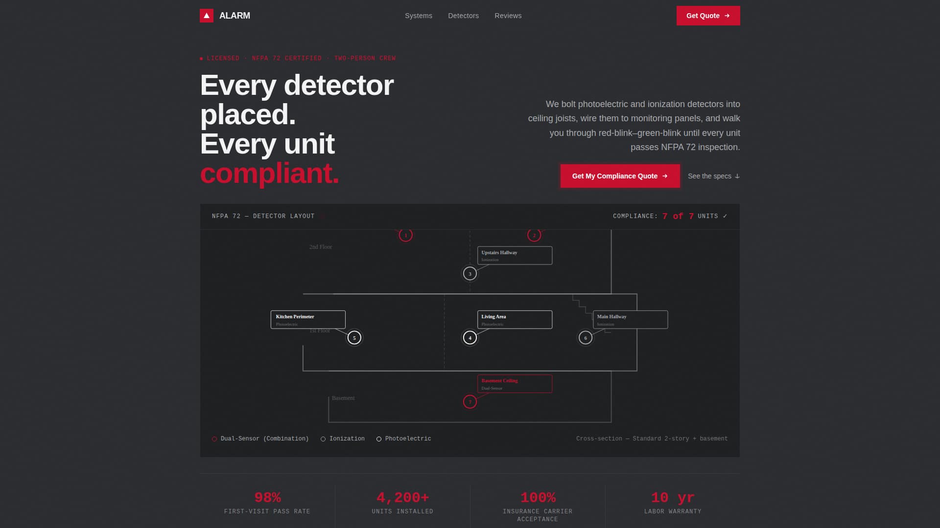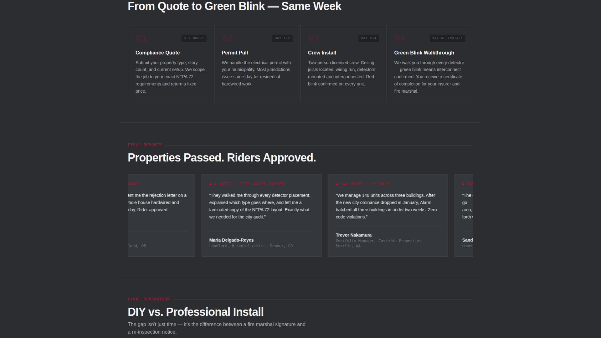 A single-column landing page built for professional smoke detector installation services. It walks property managers, landlords, and homeowners through a structured breakdown of detector types, wiring standards, and code compliance requirements. The layout uses spec-sheet comparison cards and a clear DIY-versus-professional contrast to move cautious visitors toward a compliance quote.
