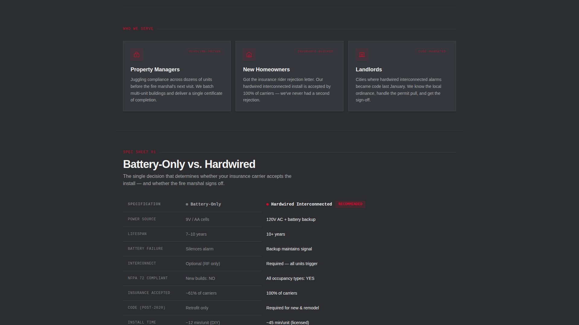 This template serves professionals who install hardwired and interconnected smoke detection systems for residential and multi-unit properties. The audience has a specific compliance urgency that generic service-page templates cannot address.