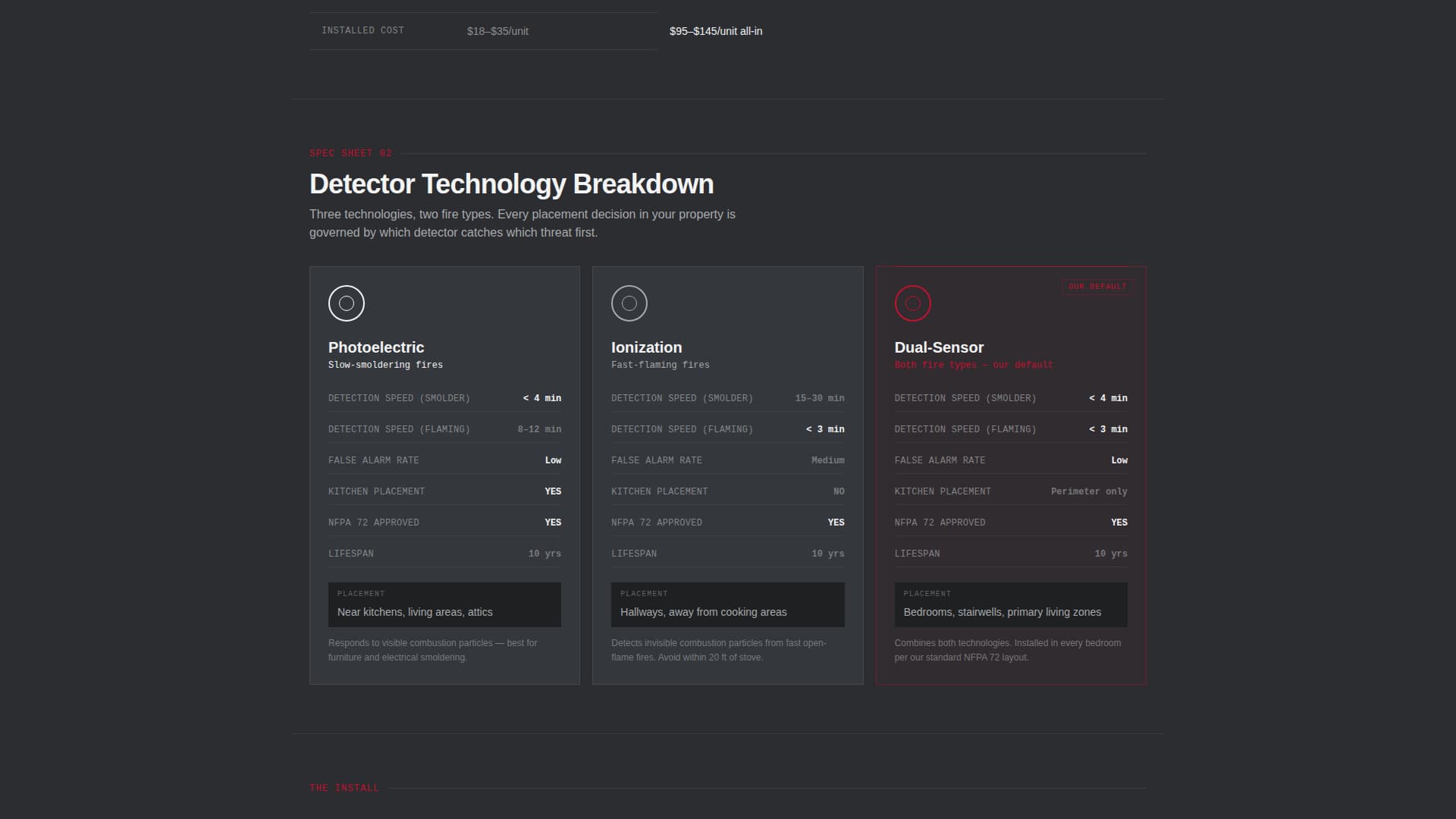Each comparison card presents two or three options in side-by-side specification columns. Attributes covered include detection speed, false-alarm rates, unit lifespan, National Fire Protection Association 72 (NFPA 72) compliance status, and installed cost. The rhythm is clinical and scannable, resolving one decision per scroll.