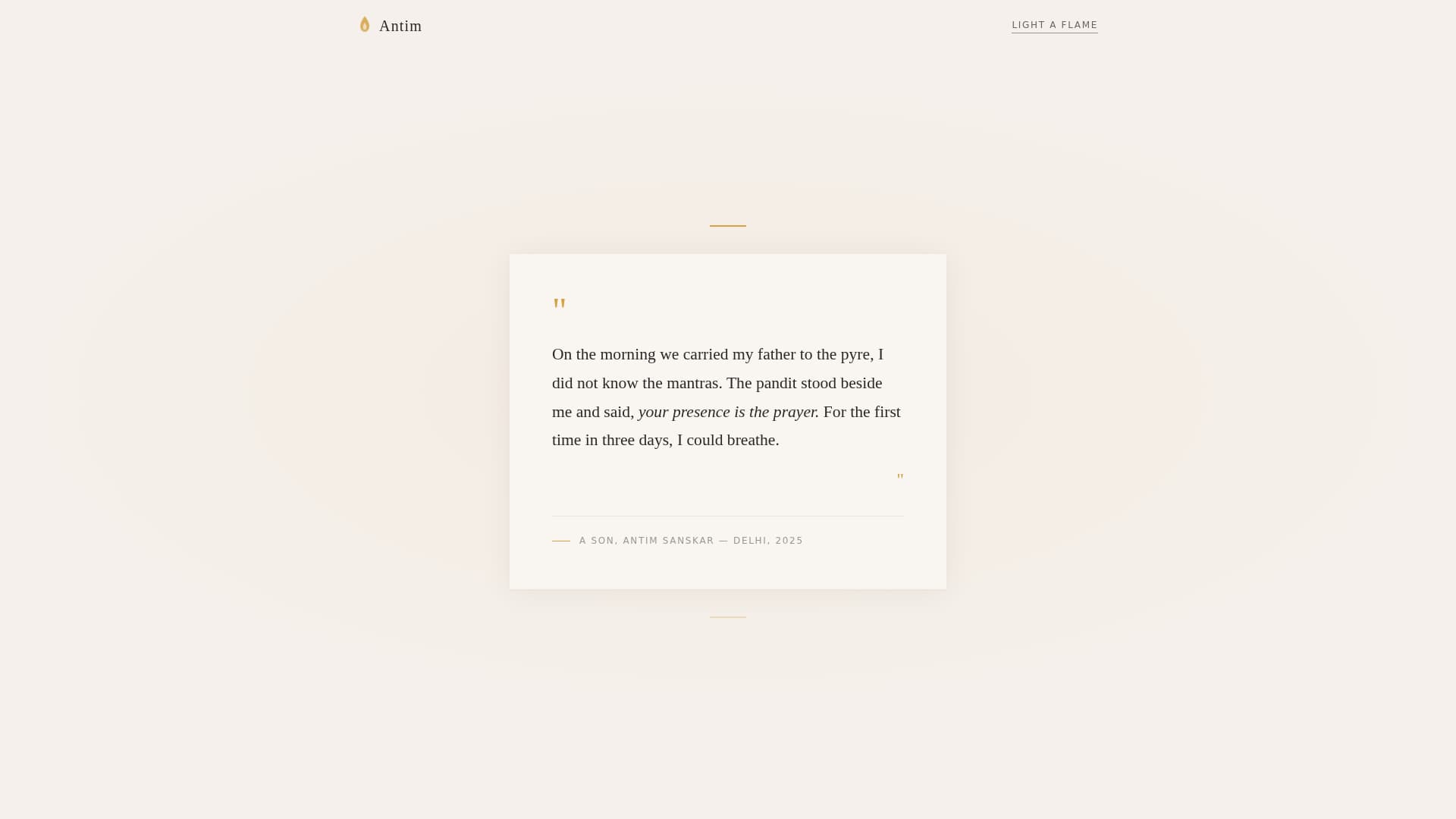 Antim is a single-column landing page for a Hindu cremation service and donation cause. It opens with an anonymous testimonial on a vast ash-white field, then guides the visitor through philosophy, ritual imagery, and three giving tiers. The page is built for grieving families and NRI donors who need sacred guidance, not a corporate transaction.