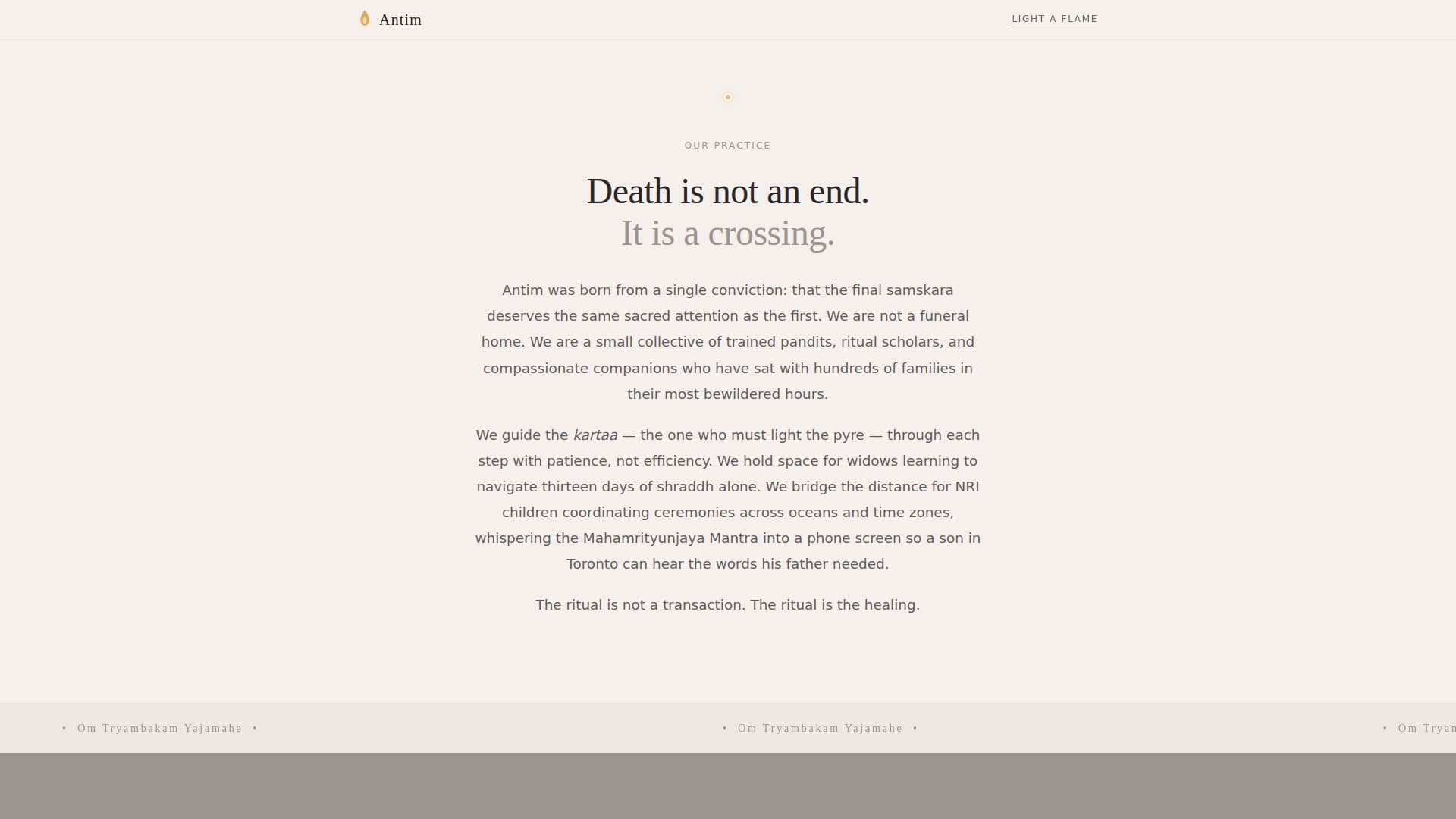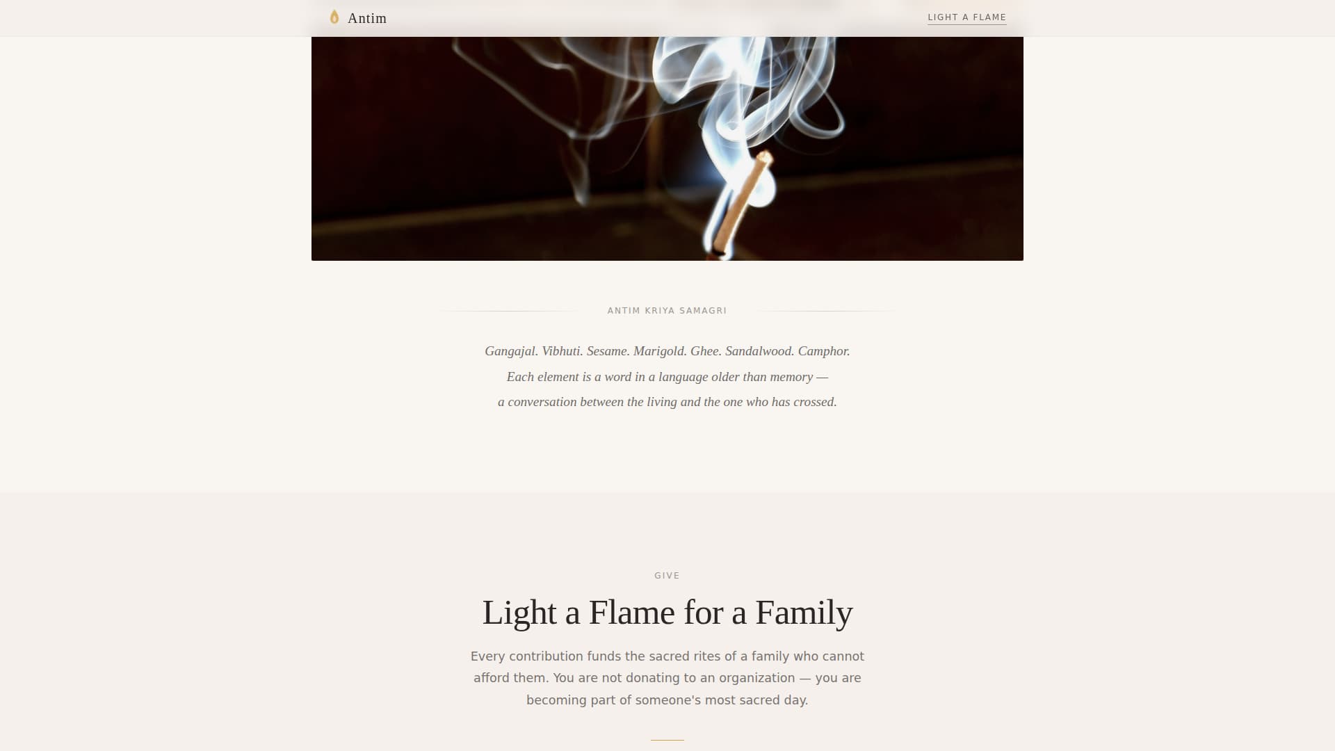 Antim is a sacred Hindu cremation service landing page built for families navigating the final samskara. Its single-column flow moves from a quiet testimonial through ritual philosophy, atmospheric imagery, and three Sanskrit-named donation tiers. The page earns charitable gifts not by asking loudly, but by holding the visitor in a space of reverence and warmth.