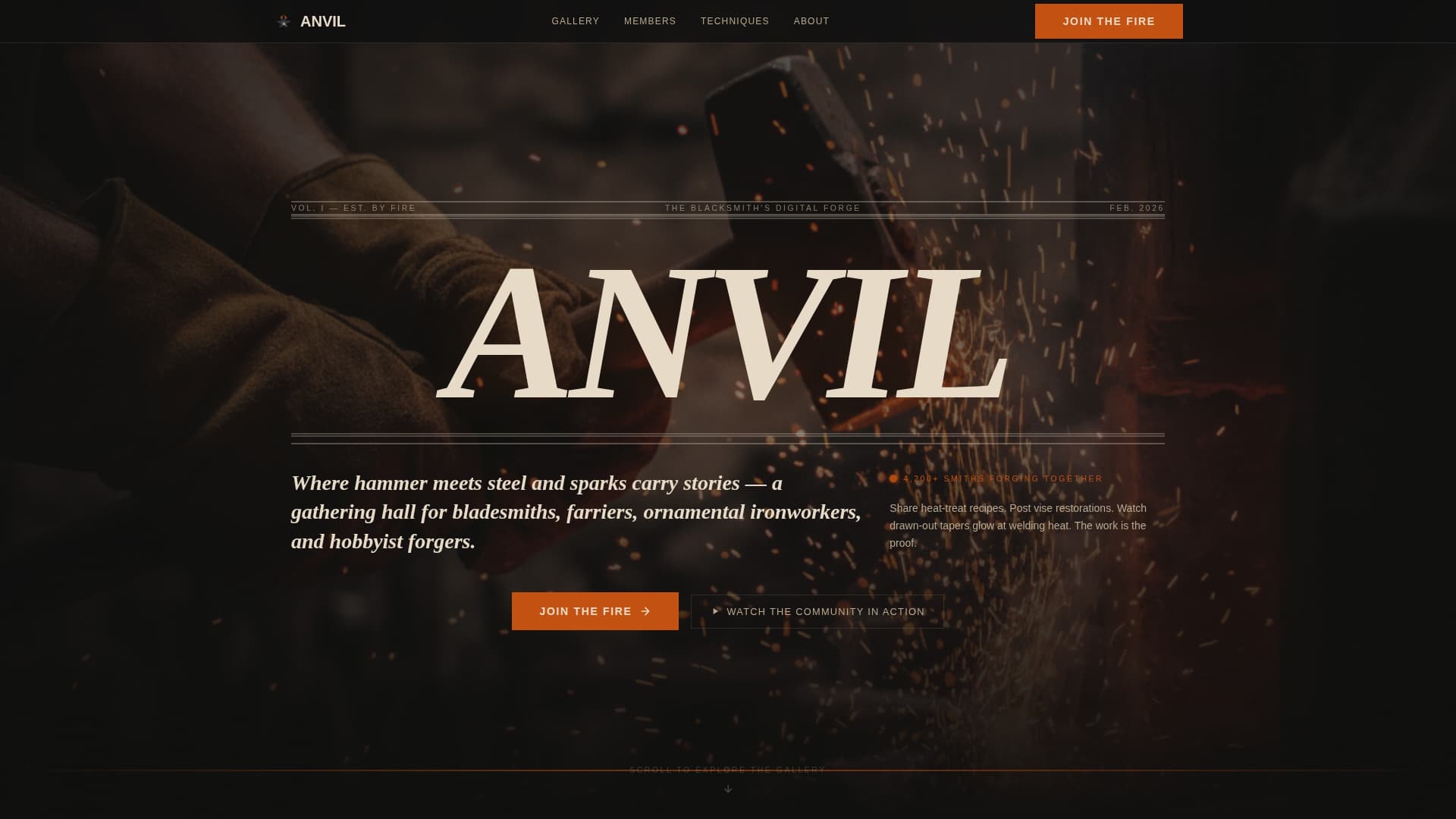 Anvil is a cinematic dark landing page template built for blacksmithing and forging online communities. It pairs a newspaper-style masthead with a masonry gallery grid to showcase member work and drive sign-ups. The heritage-inspired design uses forge-black backgrounds, ember-orange accents, and parchment-cream text to create an atmosphere that feels like stepping into a working smithy at dusk.