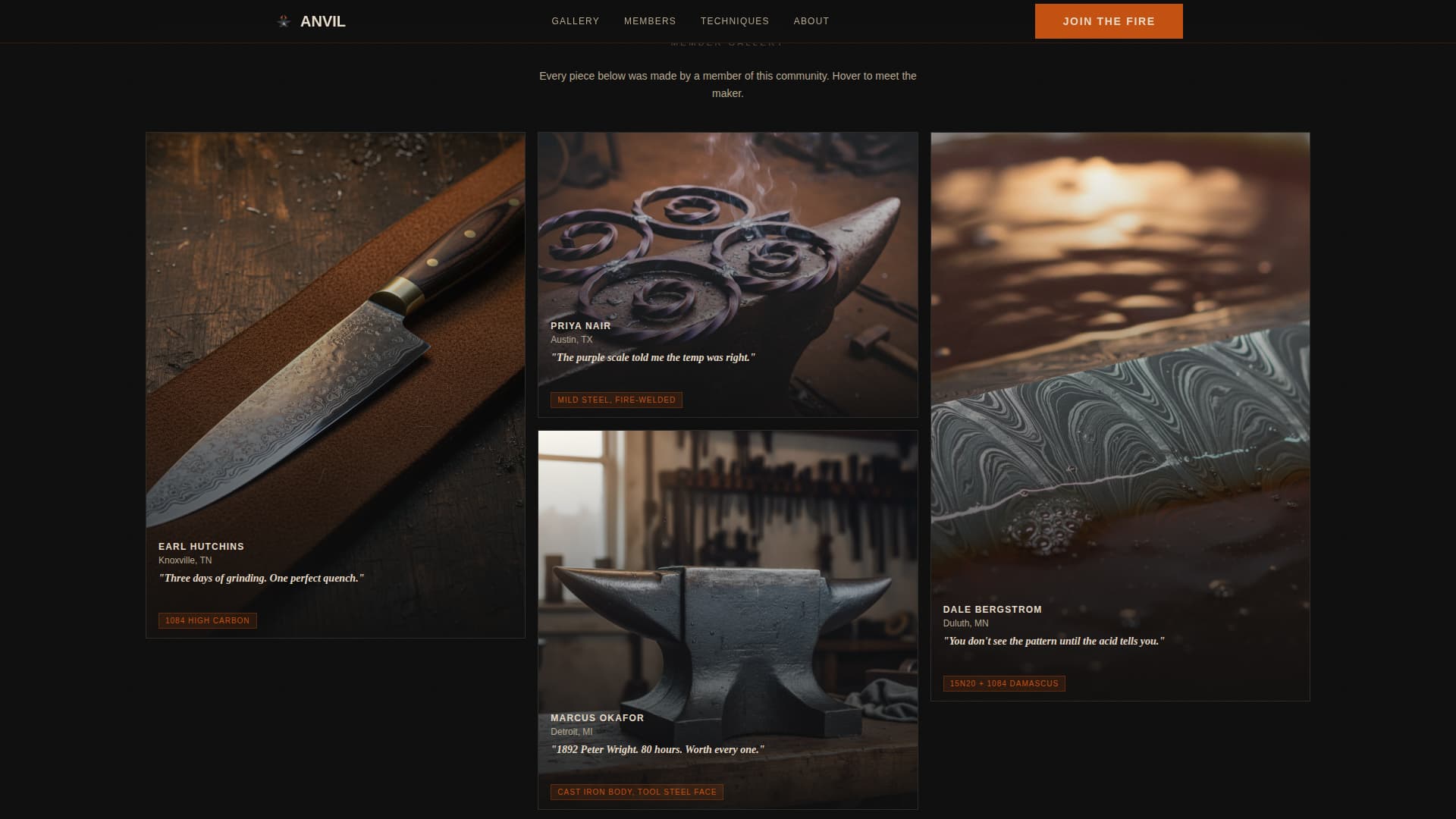 A Pinterest-style masonry grid displays member-submitted work cards. Each card carries a one-line story showing the maker, the steel used, and the technique applied. Hovering lifts the card and reveals ember-orange underlining, making every piece feel like an exhibition placard.