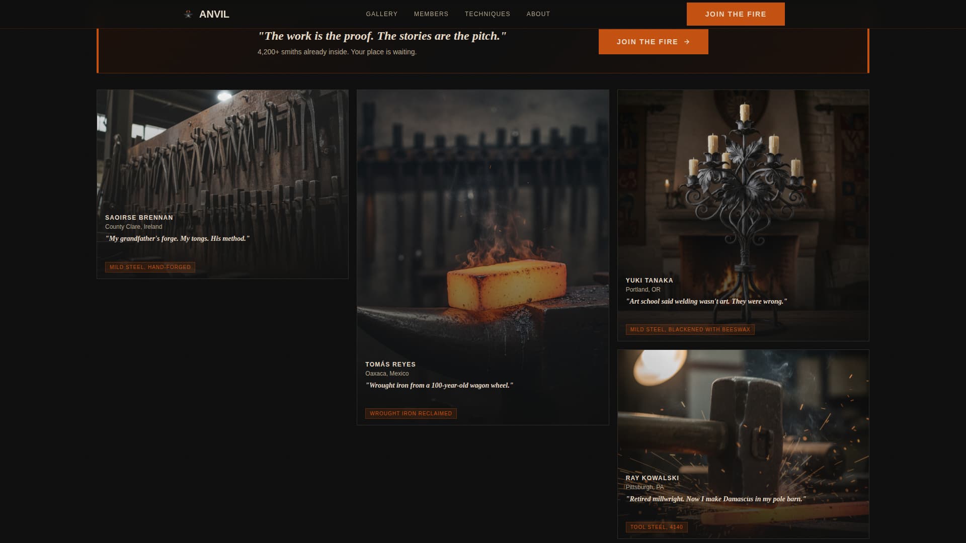 Anvil is a single-page, click-through landing page template for a blacksmithing and forging online community. It opens with a broadsheet-style masthead, flows through a masonry gallery of member-submitted work, and closes every third gallery row with a repeated call to action. The design leans on cinematic dark tones, heavy slab-serif type, and ember-orange hover states to create a place that feels earned and real.