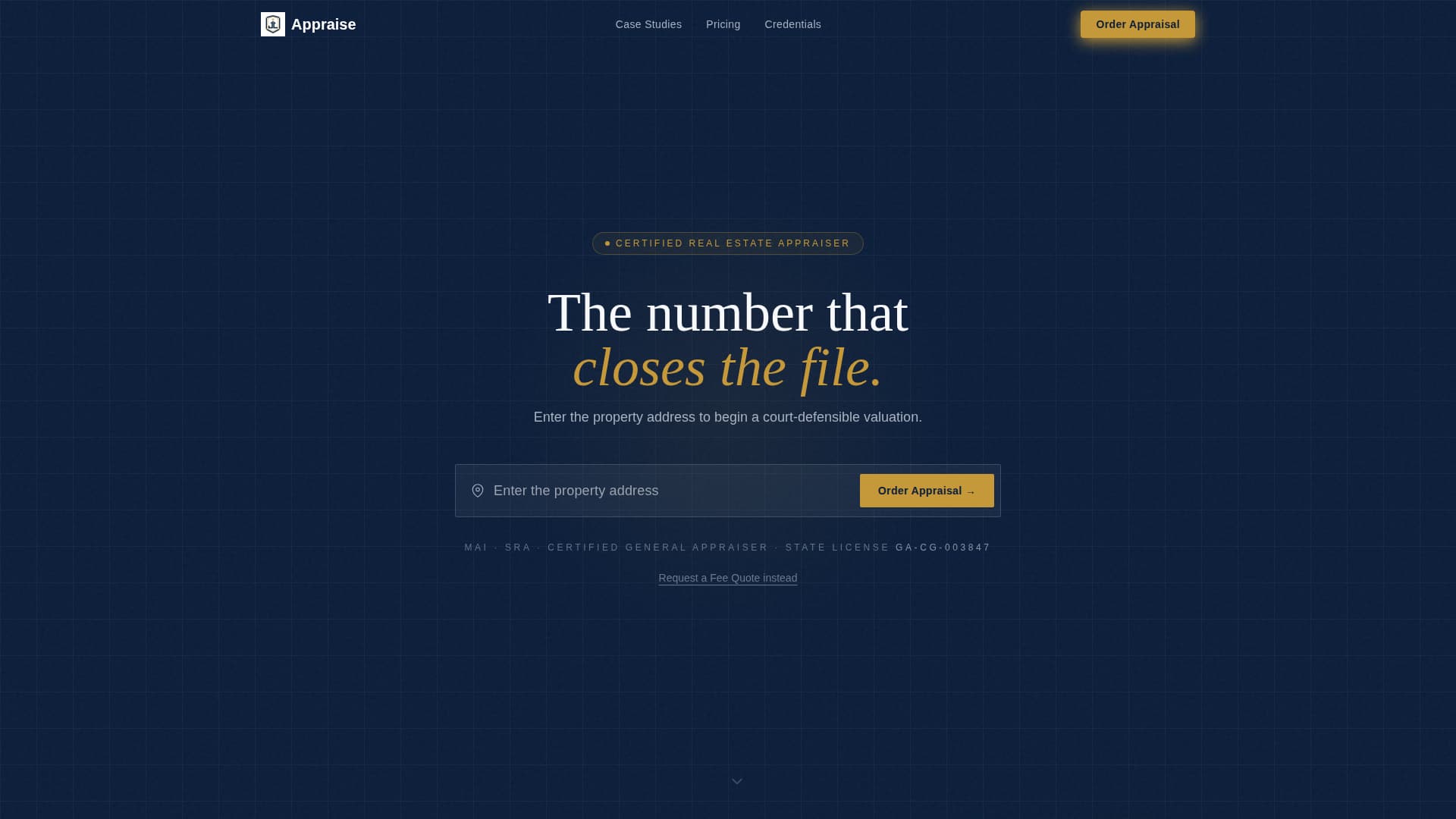 The header centers a clean address field on a deep navy background. A gold cursor blinks beside the prompt "Enter the property address," and the appraiser's credential letters and state license number appear below. No photography, no distraction, just the immediate signal that an authoritative valuation is within reach.