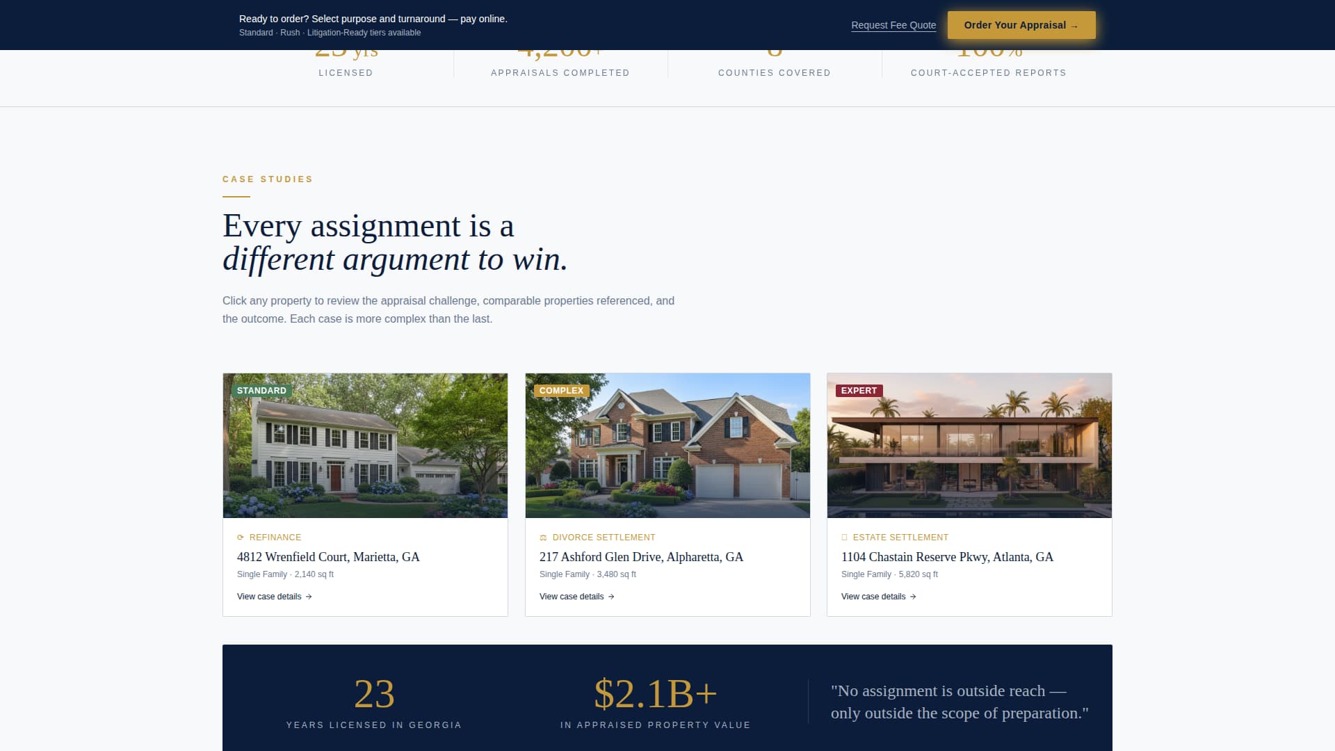 Single-stat callouts in gold type break up the gallery rows. Years licensed, appraisals completed, and counties covered appear as bold, isolated figures. They reinforce authority without interrupting the visual rhythm of the case study scroll.