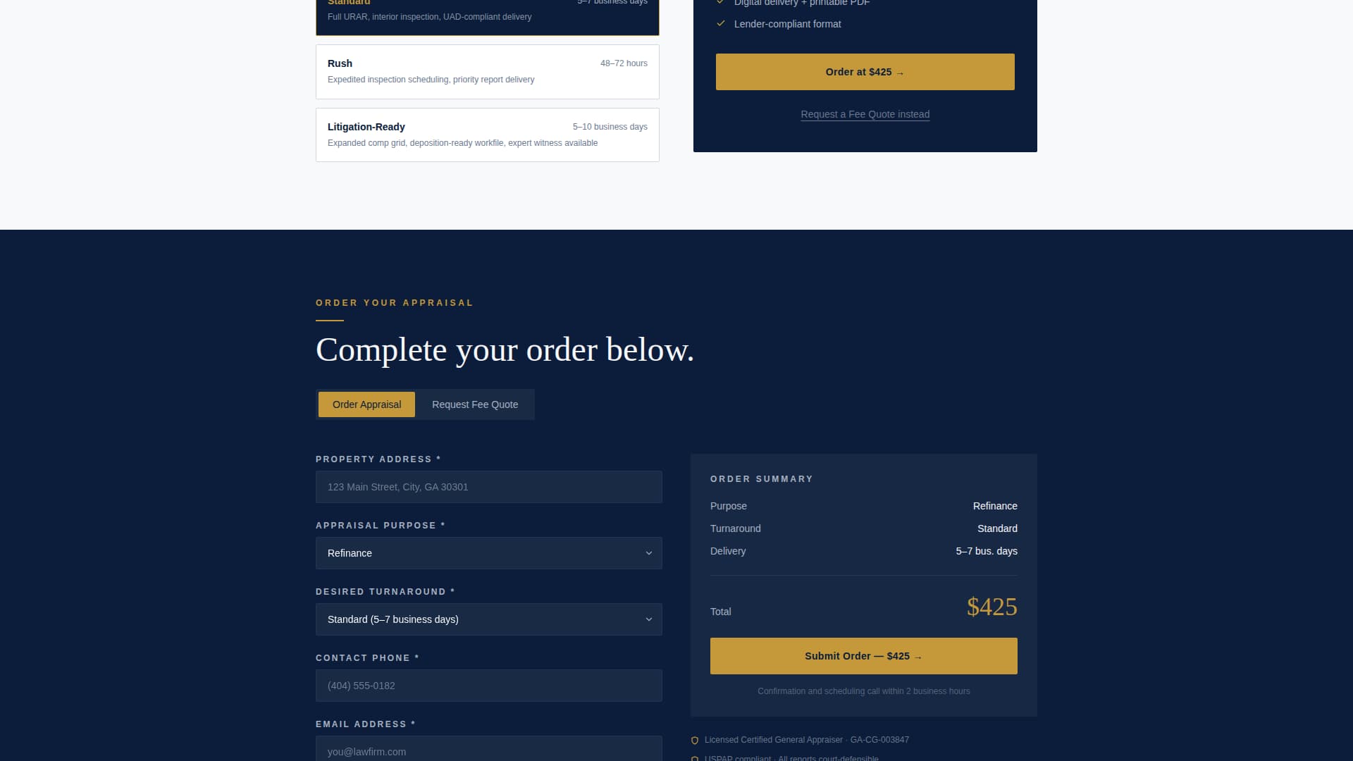 The order form collects property address, appraisal purpose via dropdown (purchase, refinance, estate, divorce, tax appeal, or PMI removal), desired turnaround, and contact phone. Pricing displays dynamically based on the selected purpose and turnaround tier, standard, rush, or litigation-ready, so the client selects and pays without a phone call.