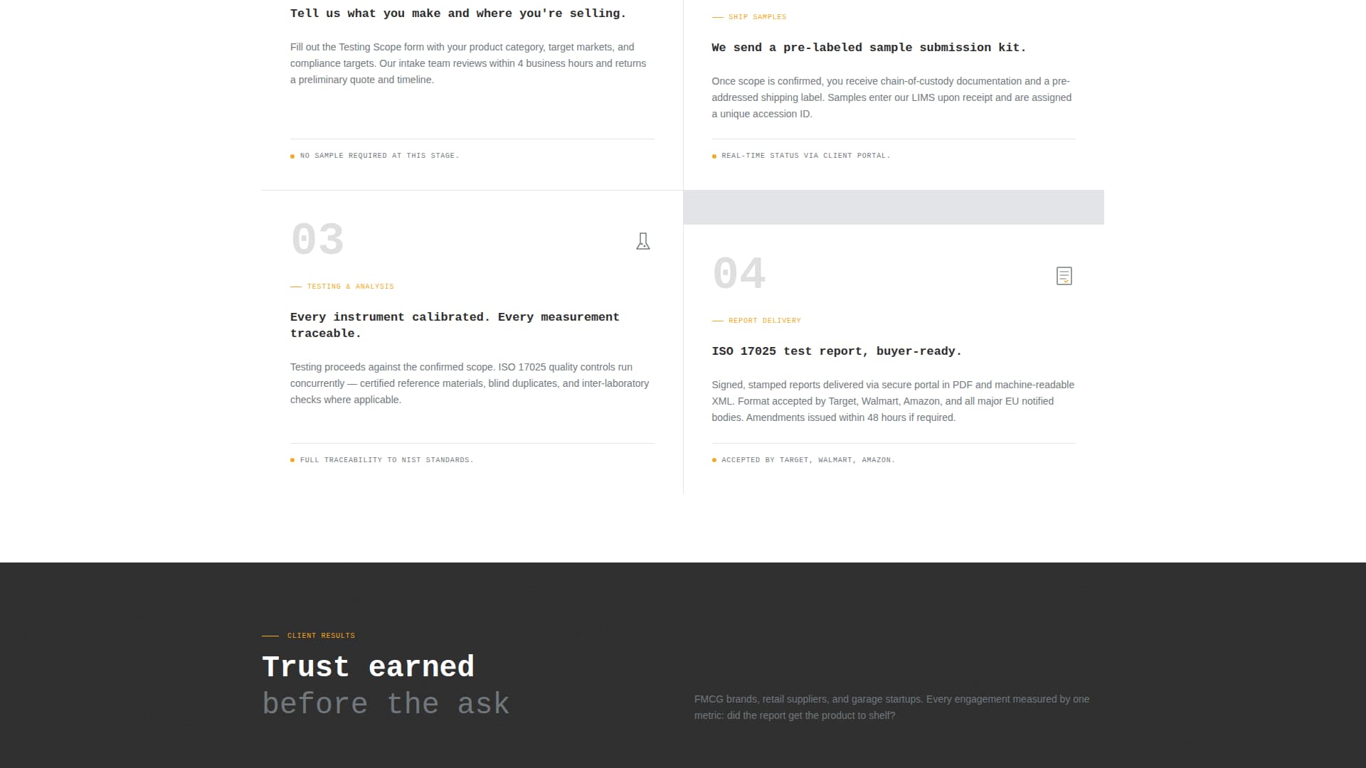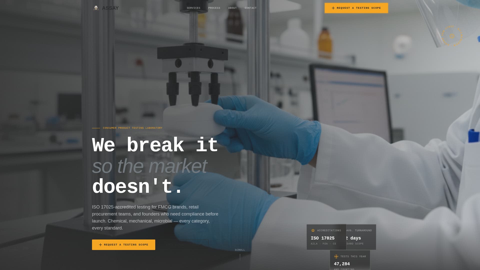 Assay is a modular card-grid landing page built for consumer goods quality testing labs. It combines a cinematic behind-the-scenes header with a spec-sheet card layout, letting B2B visitors navigate services by product category, review testing standards at a glance, and submit a scoped testing request in seconds. The design system uses a restrained monochrome steel palette with caution amber reserved for every call to action.