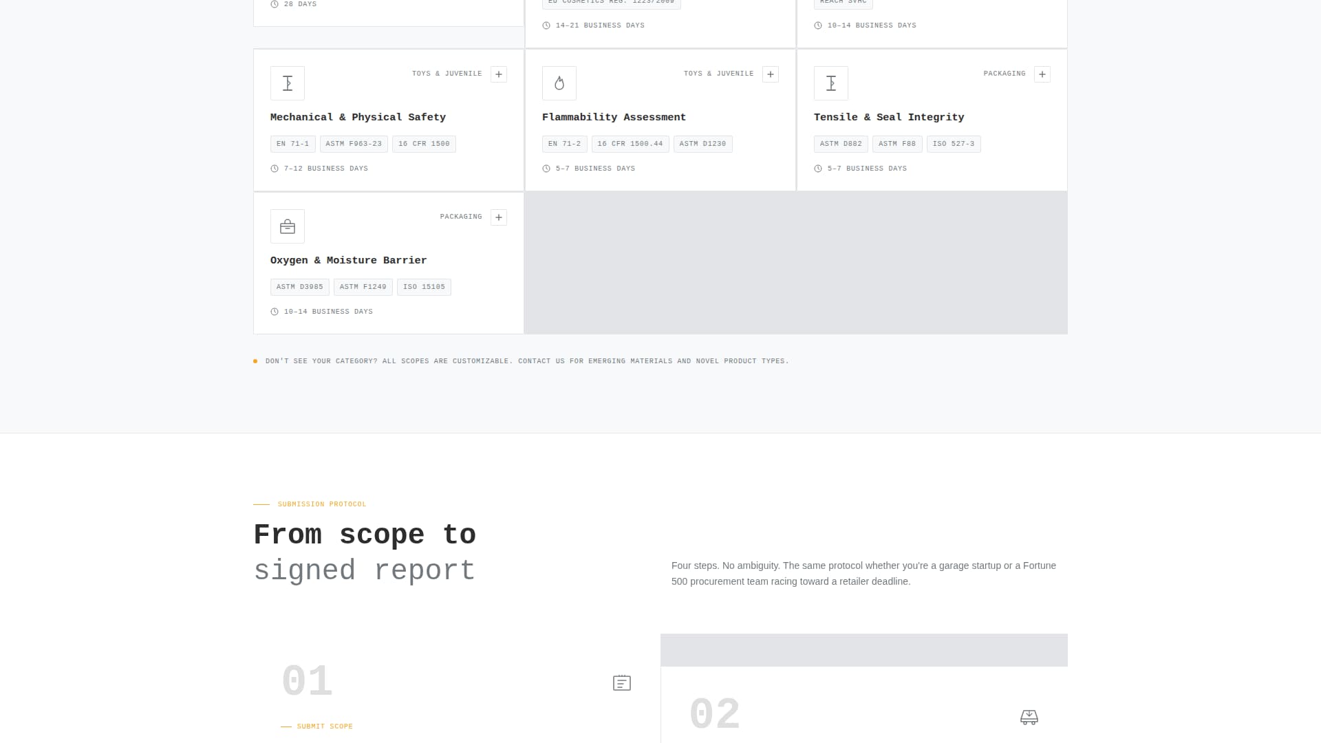 Every card expands on click to reveal full methodology detail and sample submission requirements. This keeps the grid scannable at first view while providing the depth that a procurement lead or quality manager needs before making contact.