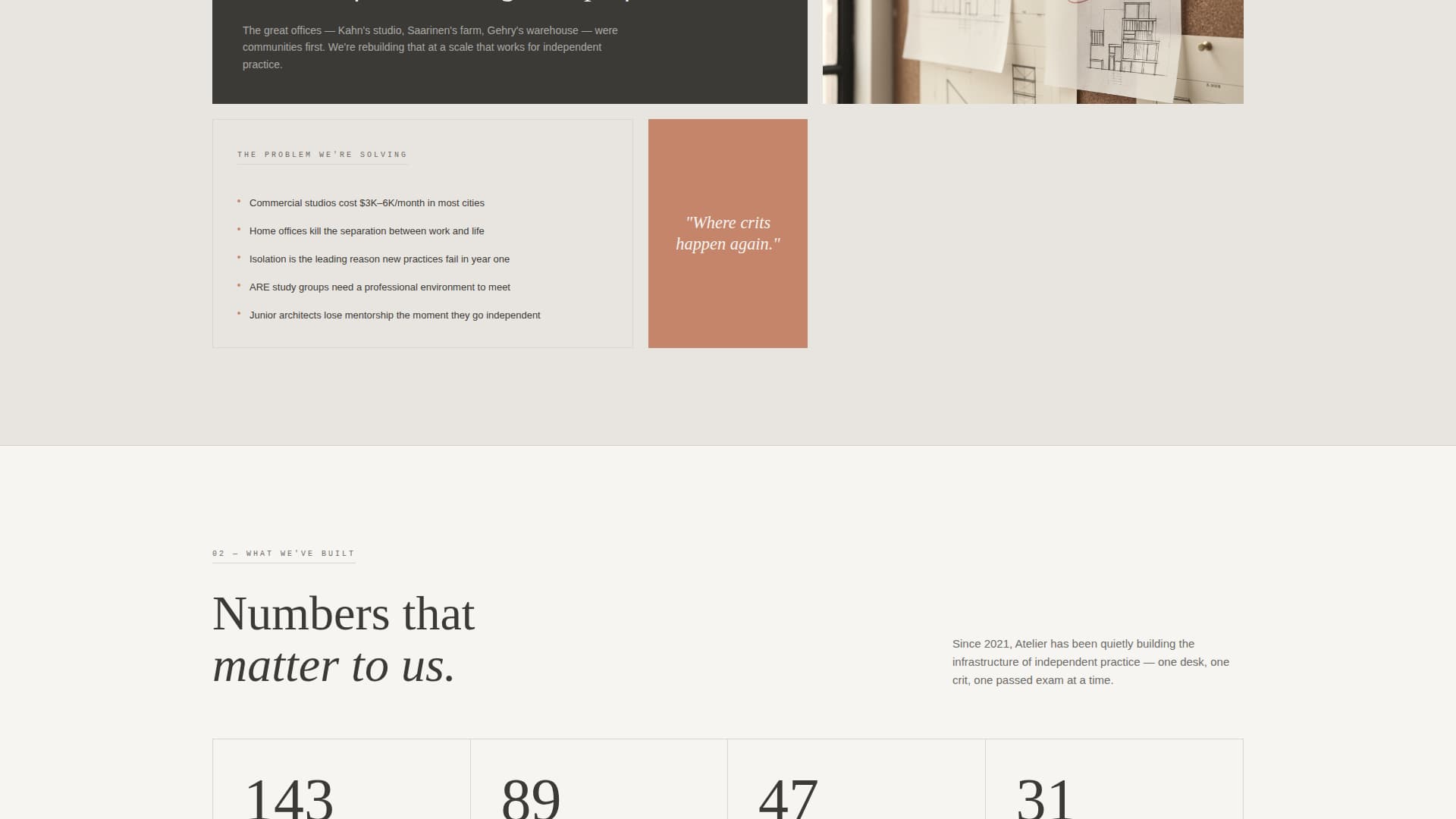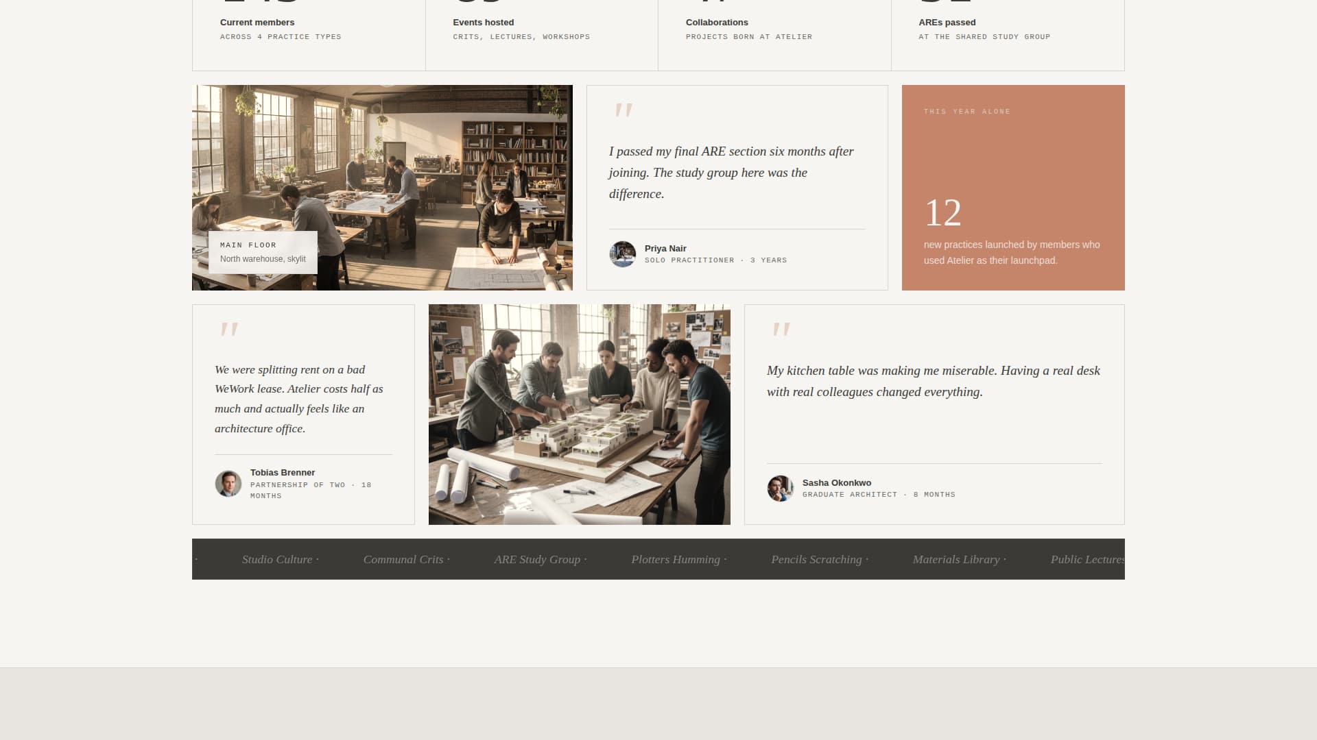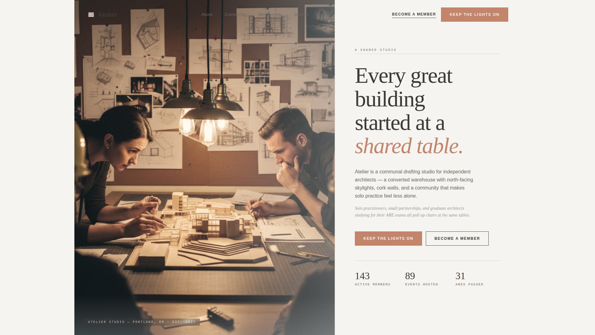 Atelier is a single-page fundraising and membership landing page built for an architects co-working community. It uses a warm editorial card grid to guide visitors from the story of solo practice to a three-tier donation flow. The layout pairs a cinematic photo header with asymmetric modular sections, community stats, member quotes, and a sticky "Keep the Lights On" call to action.