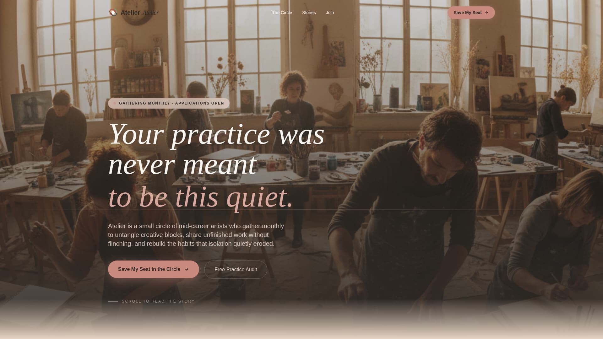 Atelier is a modular card grid landing page built for an artists and illustrators mastermind group. It unfolds an origin story through scroll-triggered card rows, leads visitors from emotional recognition to community belonging, and closes with a seat-registration form. The Desert Rose color system and full-screen video header create a warm, studio-like atmosphere that feels personal before it ever feels promotional.
