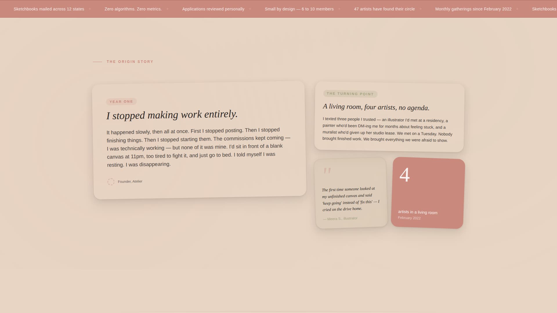 The first content row after the header uses handwritten-style type to tell the founder's personal story. Cards unfold chapter by chapter: the year the founder stopped making work, the first gathering of four artists, and the rituals that grew from it.