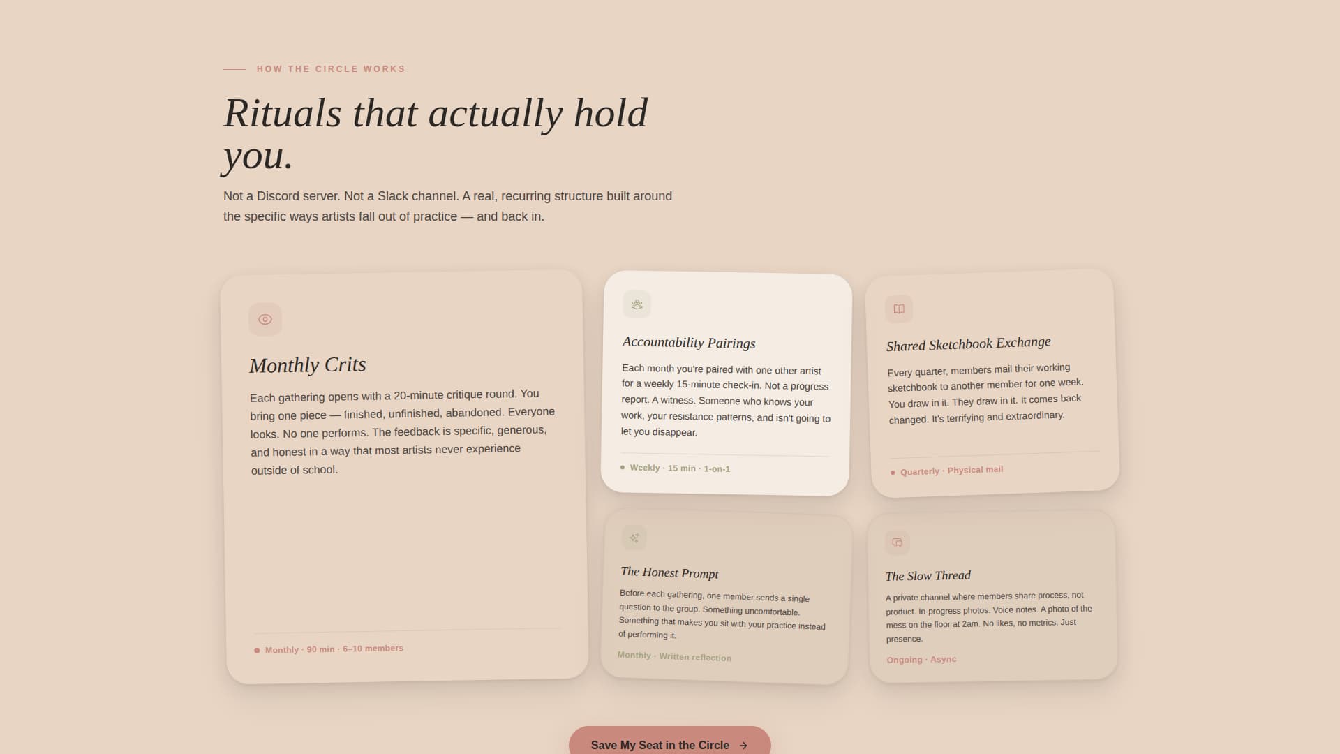 A bento-style card grid presents how the circle operates. Monthly critiques, accountability pairings, and shared sketchbook exchanges each occupy their own modular card, keeping the explanation visual and digestible.