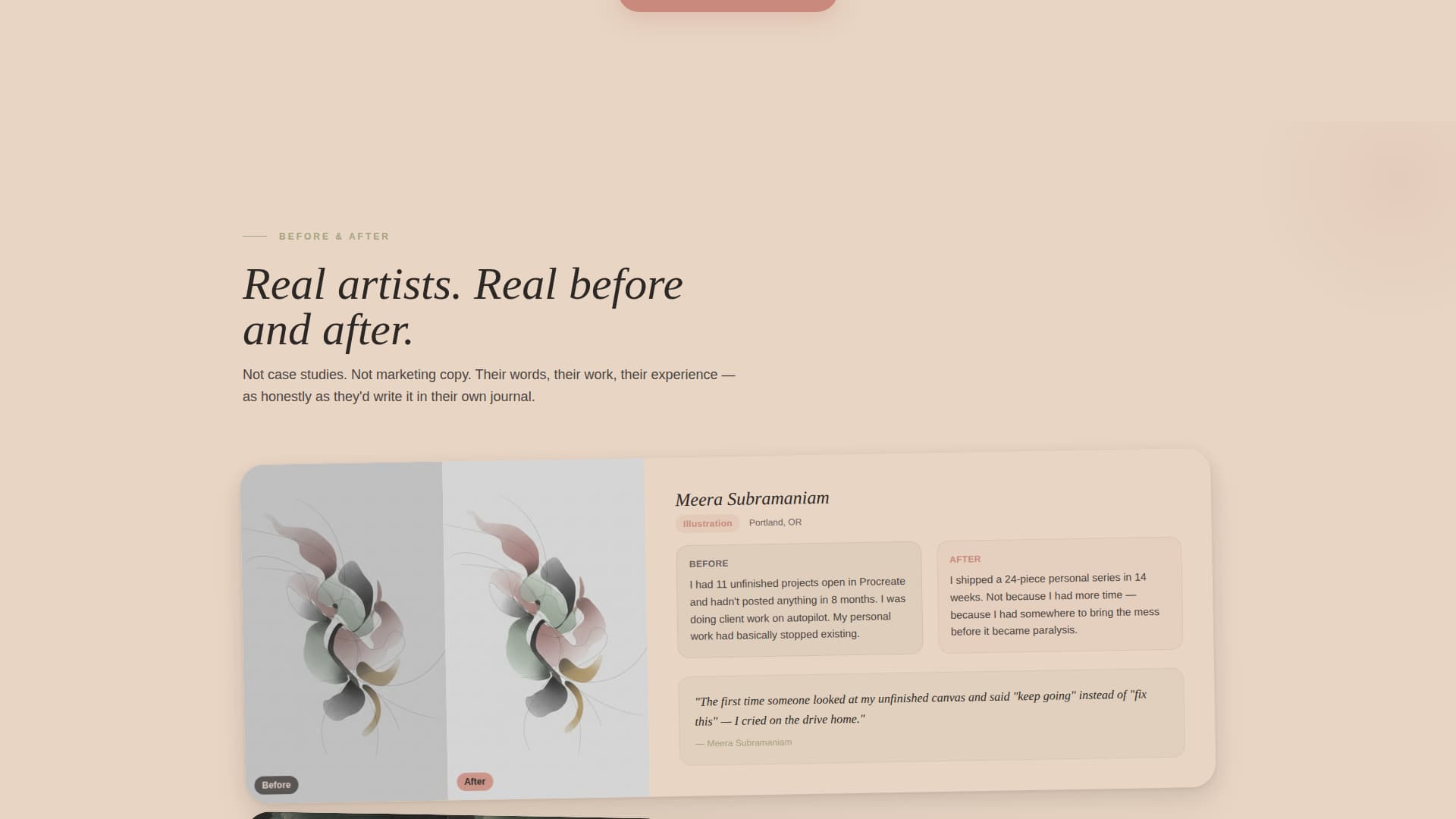 Before-and-after artist story cards show real creative output changes alongside the artist's own words. These are styled as honest side-by-sides, not polished case studies, giving social proof that feels earned rather than curated.