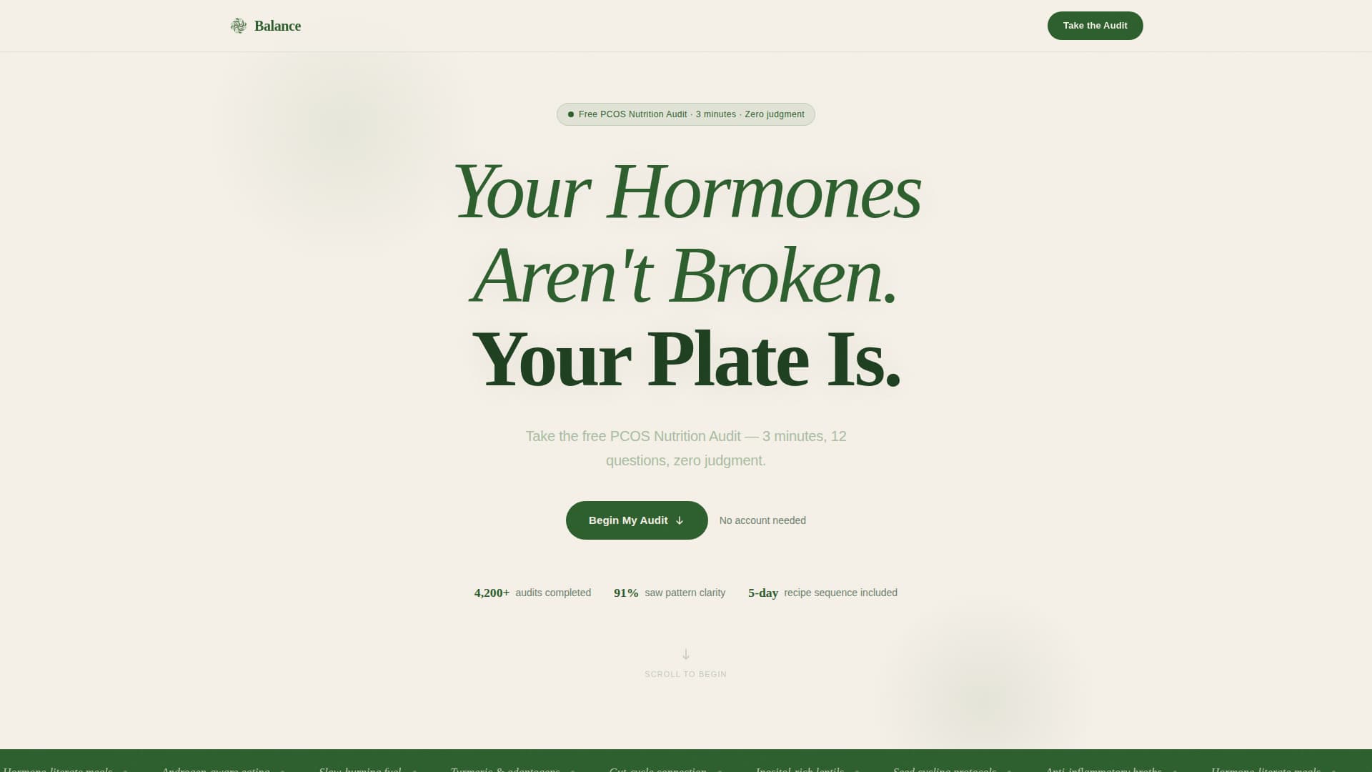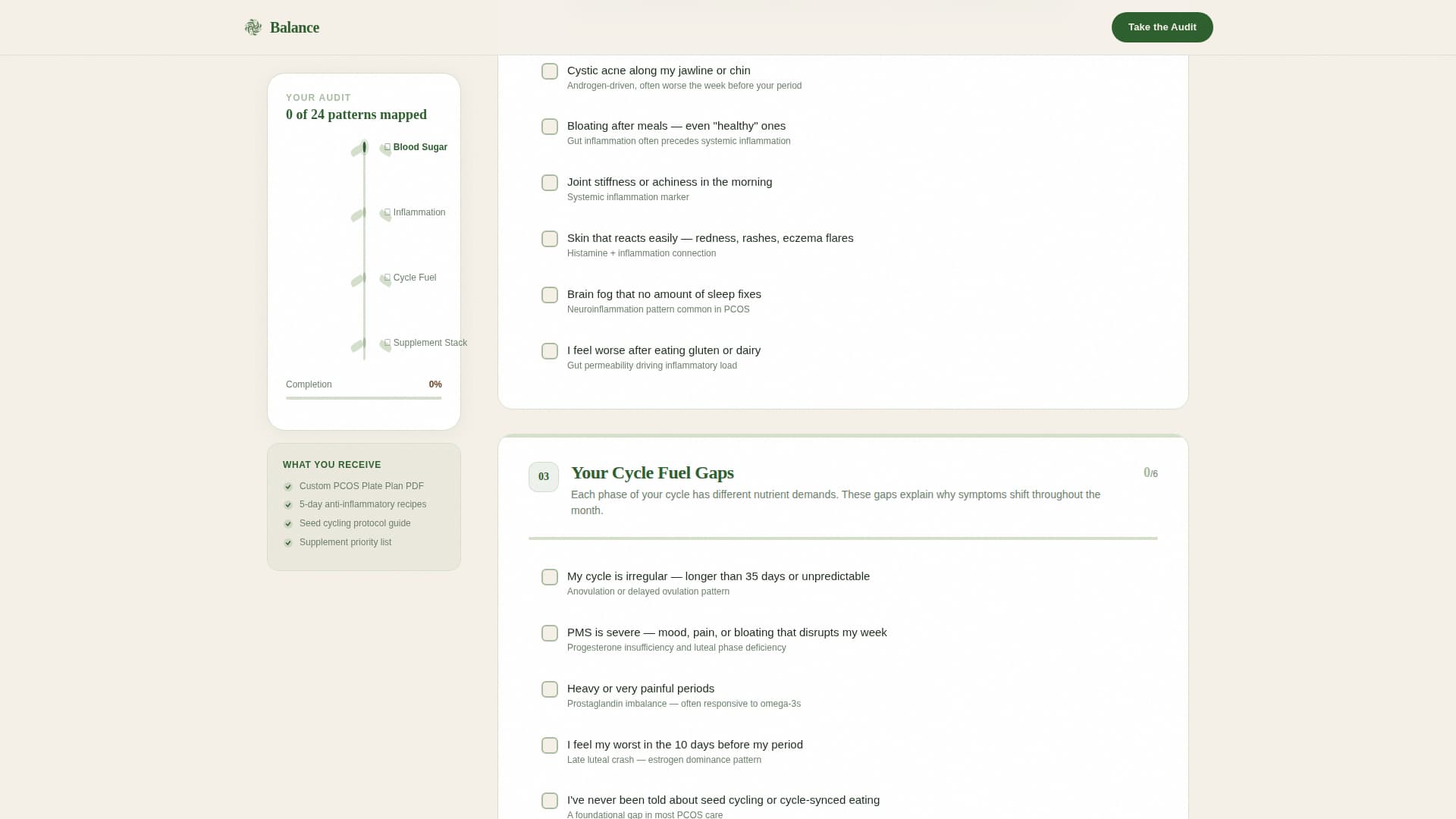 Balance is a single-page audit template designed for PCOS nutrition programs. It guides visitors through four self-assessment modules covering blood sugar patterns, inflammation triggers, cycle fuel gaps, and supplement habits. A sticky sidebar tracks progress visually as checkboxes are completed. The page ends with a low-friction form that delivers a personalized plate plan and recipe sequence by email.