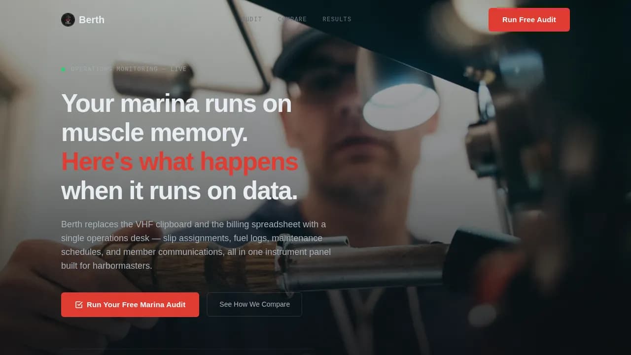 Berth is a single-page landing page template built for marina management platforms targeting harbormasters, marina owners, and yacht club operators. It combines a cinematic dark operations-room aesthetic with a scroll-driven audit structure, comparison tables, and a dual-path conversion system. The template helps marina managers turn operational frustration into a decisive call to action.
