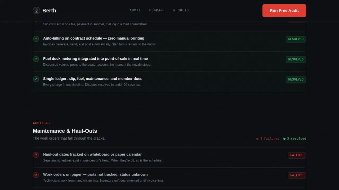 Berth is a high-impact landing page template designed for marina management software platforms. It uses a dark, instrument-panel visual system and a checklist-and-audit scroll structure to name every inefficiency marina managers live with daily. The template guides visitors from recognition to conversion through diagnostic sections, head-to-head comparison tables, social proof metrics, and a targeted audit form.