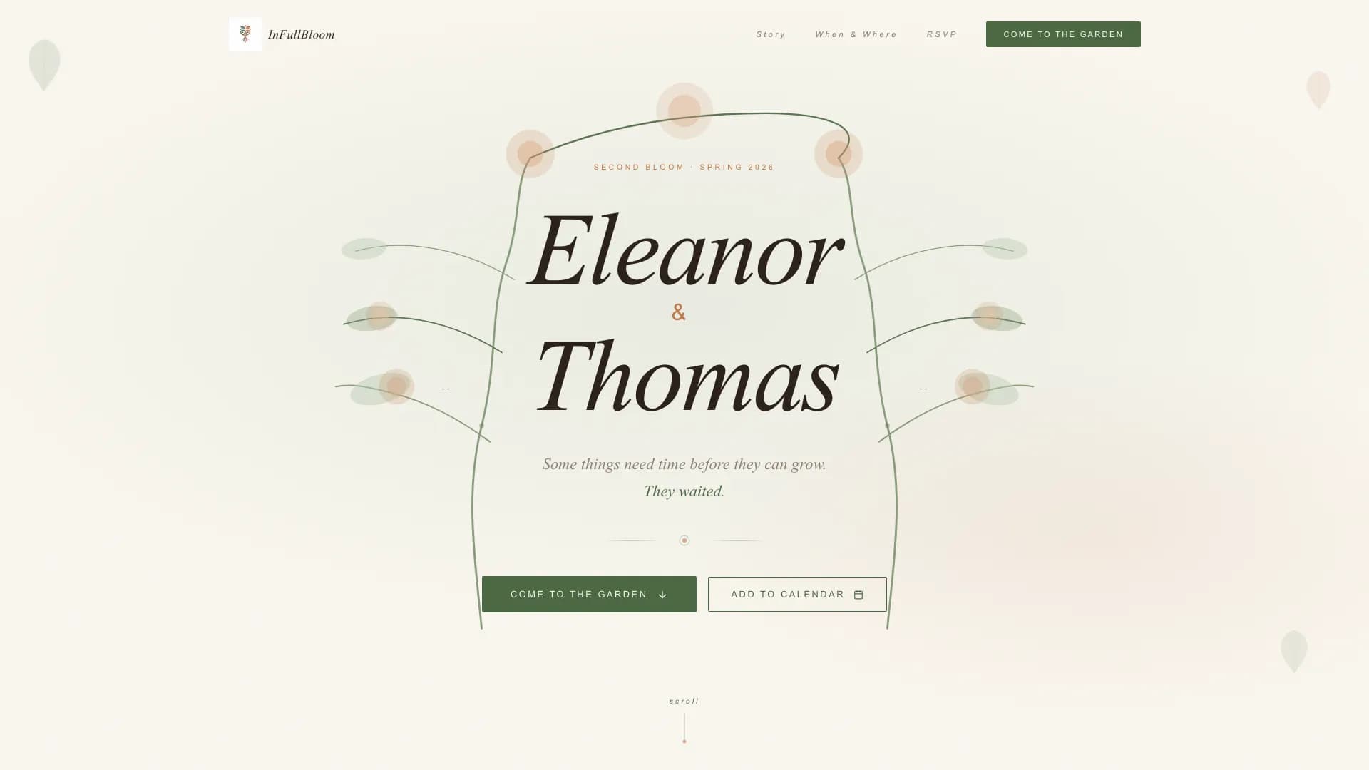 The hero section opens with a full-bleed botanical illustration. On page load, the second bloom illustration grows across the canvas. The couple's names are woven into the growth as if they have always belonged there. Leaves unfurl slowly on section entry throughout the page, giving every scroll a sense of quiet emergence.