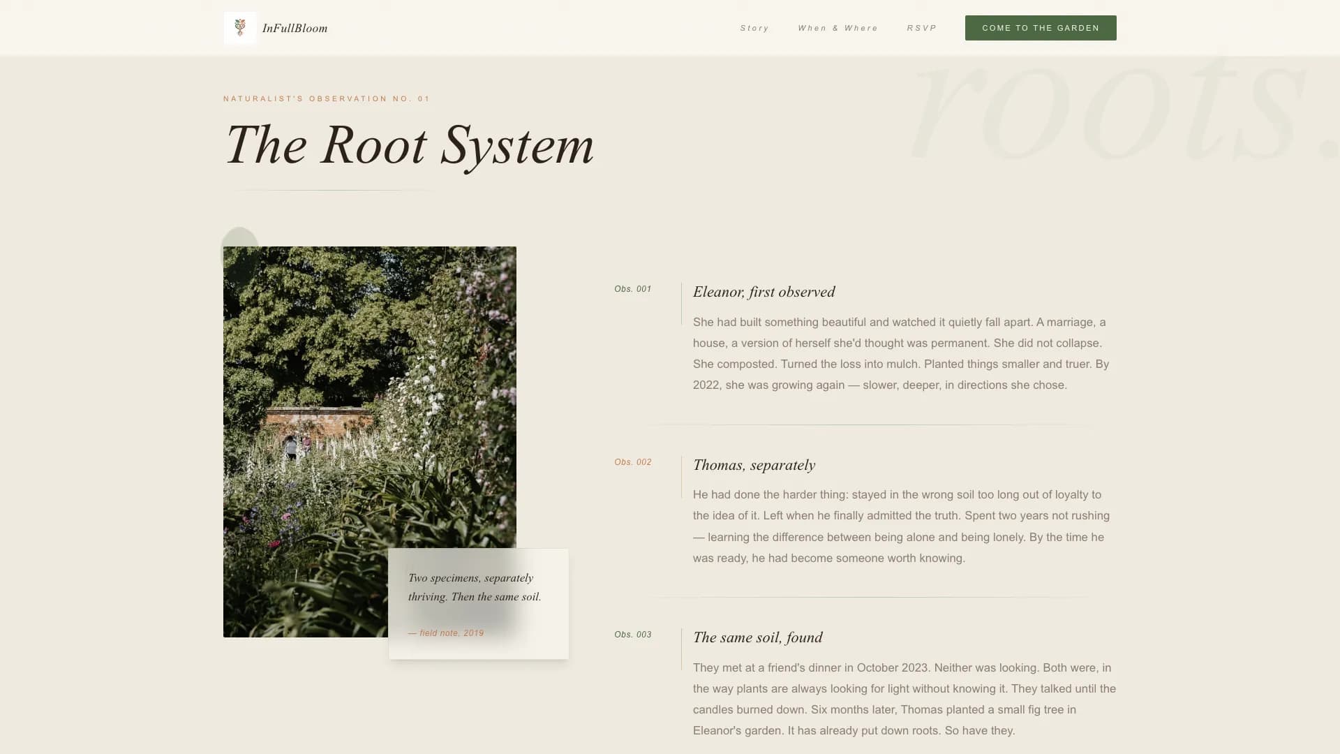 The story section, titled "The Root System," presents the couple's narrative as a naturalist's observation. Two plants finding the same soil. The copy structure is specific and grounded, avoiding forced metaphor. This dedicated section is one of the most important elements of any second-marriage landing page, giving guests the personal touch of a real, honest love story.