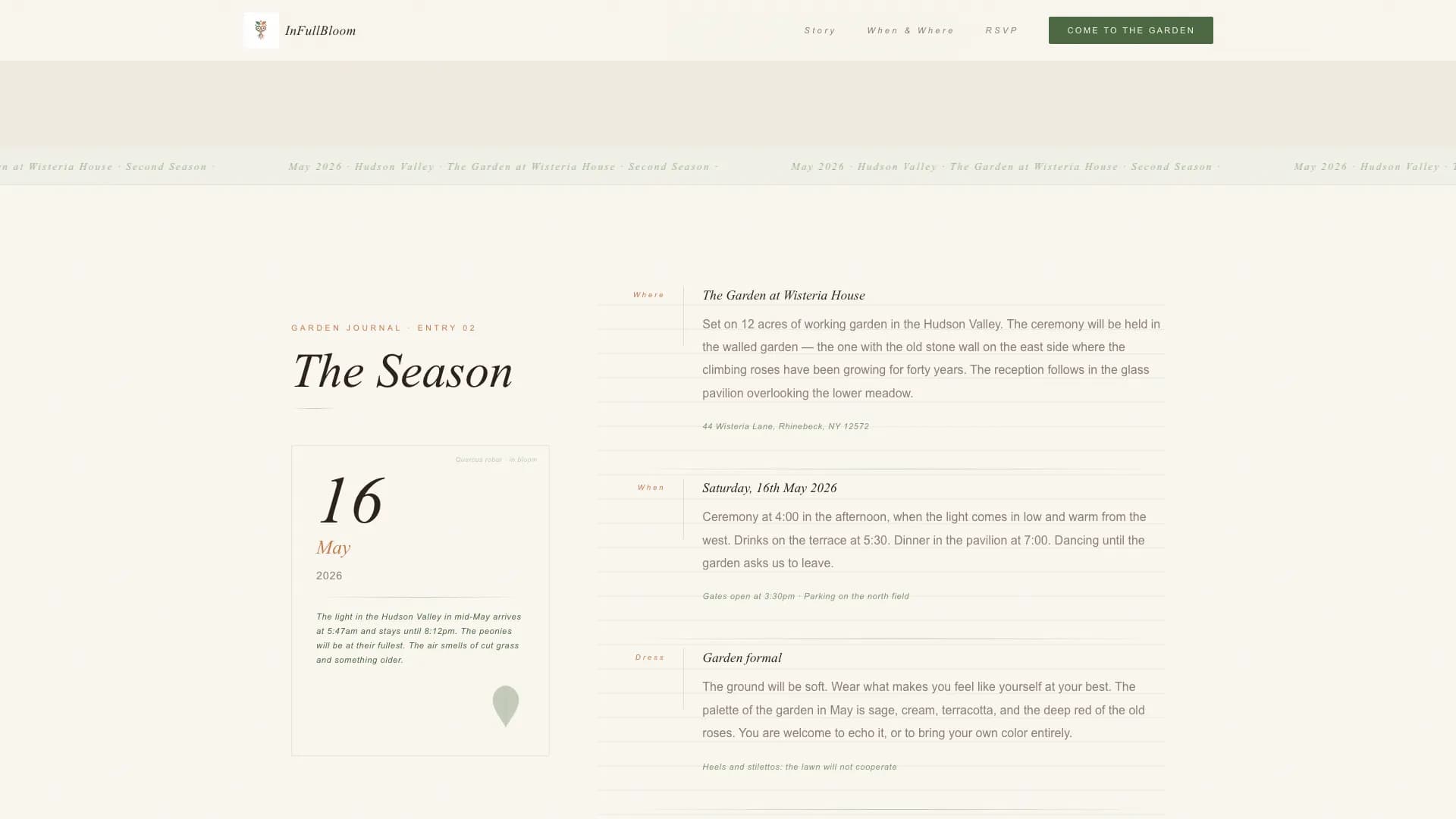"The Season" section frames wedding day details as a journal entry. It highlights the specific date, the expected light, and the flowers in bloom at that time of year. Guests receive ceremony and reception information in a format that feels intentional and warm rather than administrative. This approach helps loved ones understand the event's atmosphere before they arrive.