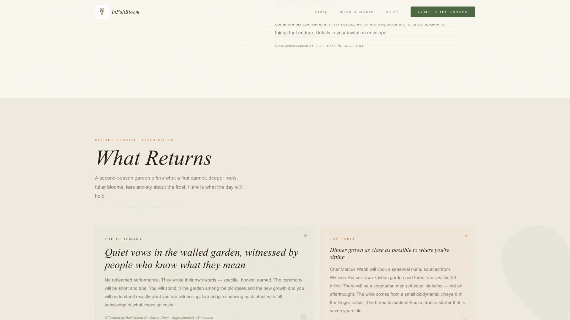 "What Returns" describes the wedding in the language of a garden entering its second season. Deeper roots, fuller blooms, less anxiety about the frost. This section communicates what the celebration will hold without listing logistics. It acknowledges that the wedding day carries both history and hope, giving guests a clear emotional anchor for the event.