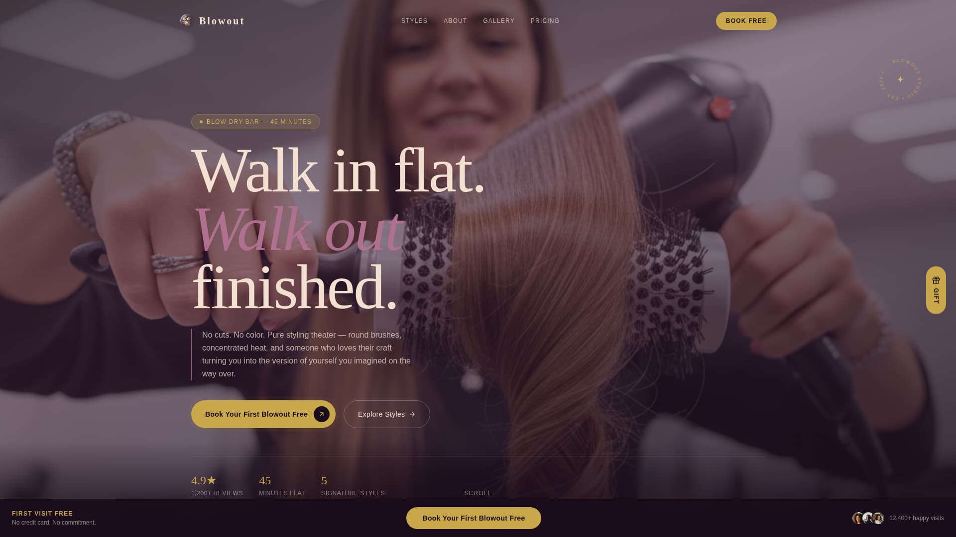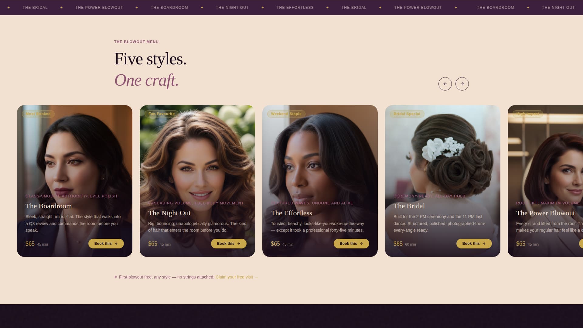Blowout is a full-width immersive landing page template built for blow dry bars. It opens with a slow-motion video header, flows through a marketplace-style style menu with looping video cards, and closes with a zero-risk booking offer. The deep plum and gold color system delivers dark luxury from the first scroll to the final call to action.